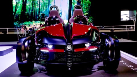 次に、「エンデバー・トゥールビヨン コンセプト タイガーアイ」。青系の石はファルコンアイ(鷹目石)、赤系の石はオックスアイ(雄牛眼石)という天然石のタイガーアイ(虎目石)をコンセプトにした限定モデルだ。ロゴとインデックスを排し、6時位置に開口部を設けてフライング トゥールビヨンを際立たせたダイアルが特徴である。各色50本ずつの限定だが、2021年は25本ずつ、2022年に25本ずつという予定になっている。価格は924万円。