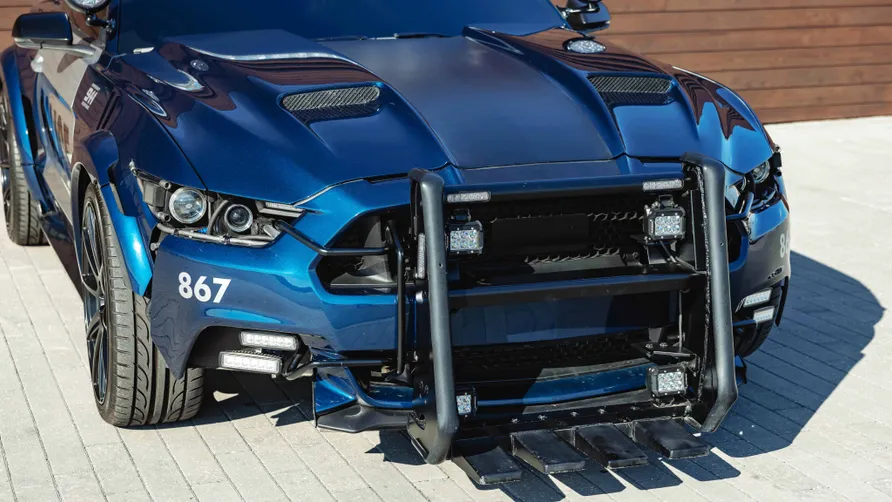 このマスタングは、映画のためにKustom Creationsによって製作され、パラマウント ピクチャーズが2016年3月に131,970.80ドル(1,885万円)という非常にピンポイントな価格で購入した。法執行機関スタイルのグラフィック、巨大なリアウイング、フル装備のポリスライト、威圧的なフロントバンパー、ワイドボディキットなどなど、劇中のバリケードを完璧に再現するための様々なモディファイが施されている。
