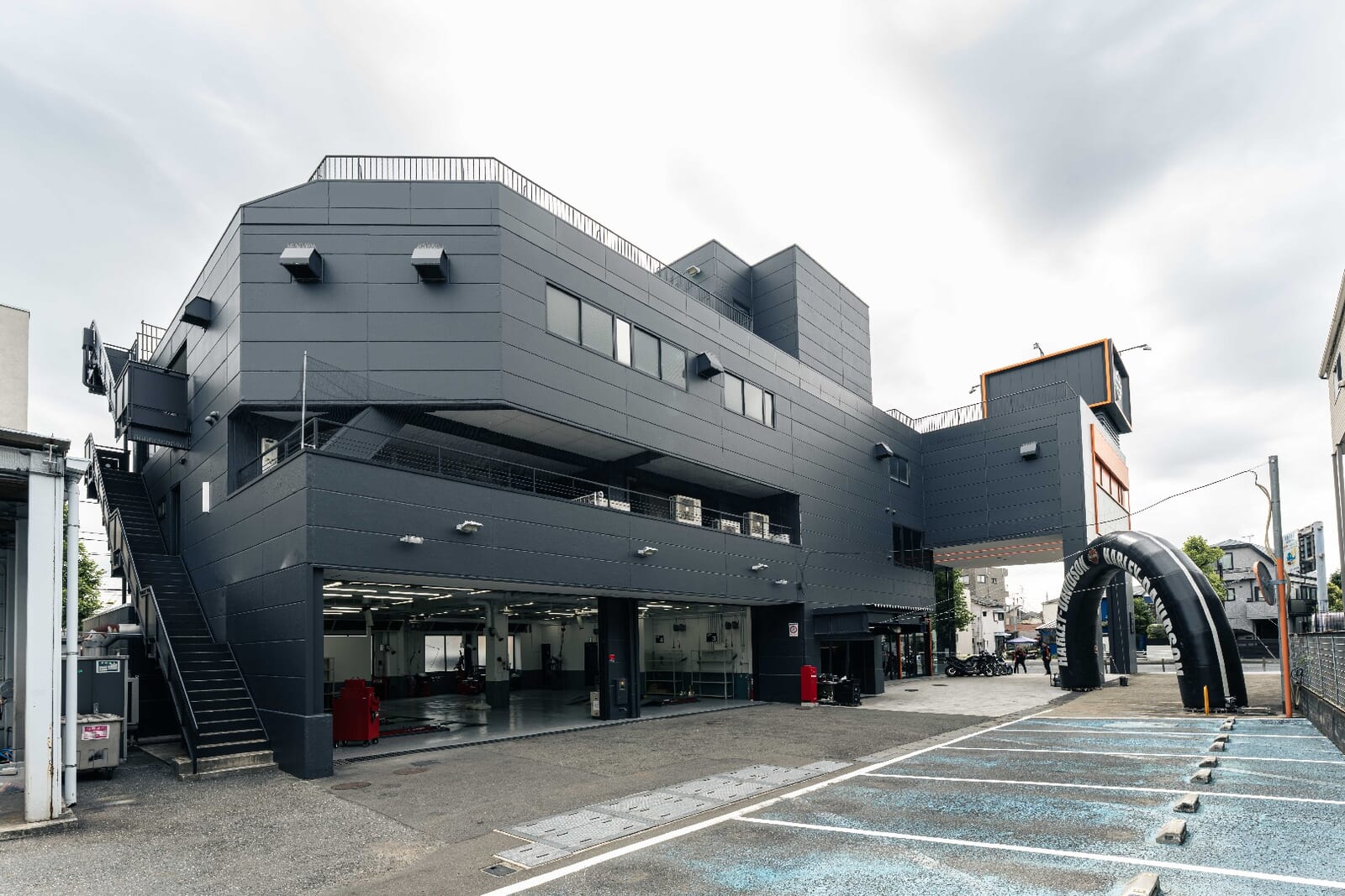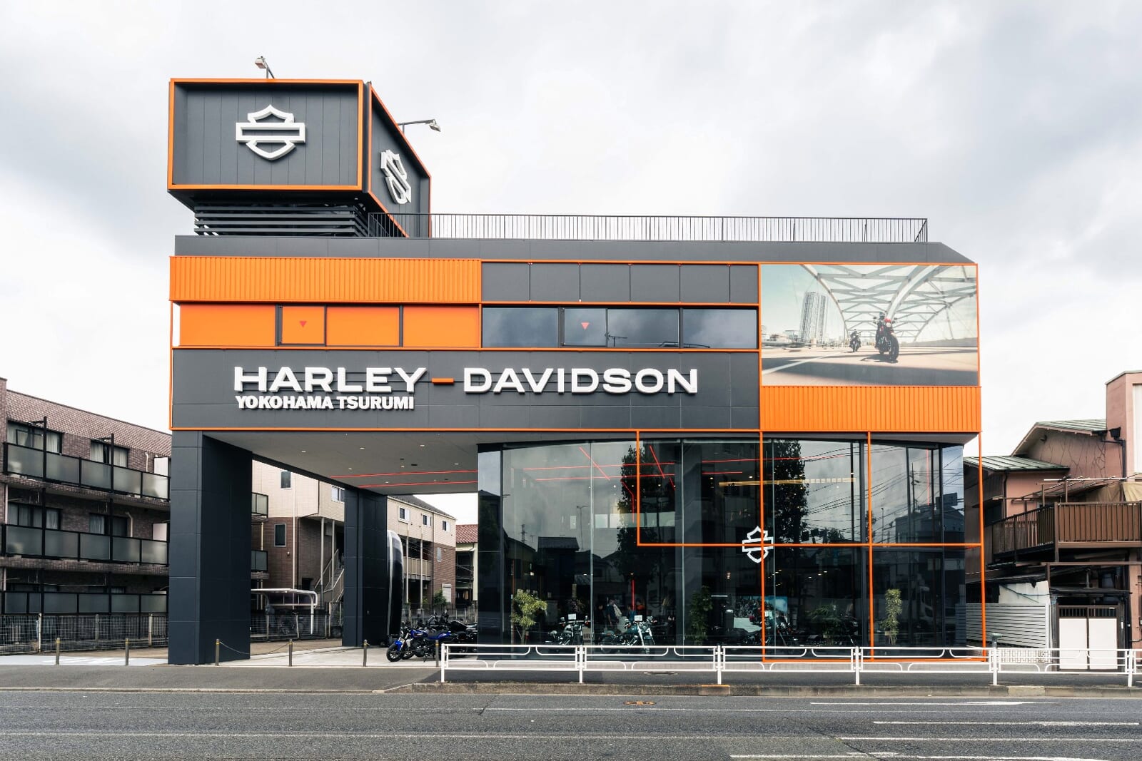 「ハーレーダビッドソン横浜鶴見」は横浜の環状2号線と140号の交わる上末吉の交差点に位置する。工場をイメージしたこの建物は黒を基調にオレンジのアクセントカラーが眩しくハーレーらしいショールームの外観となるが、頭上に輝く「バー&シールド」と呼ばれるハーレーのロゴから「HARLEY DAVIDSON」の文字が消えアウトラインだけになったことで、訪れる人を少し戸惑わせるかも知れない。