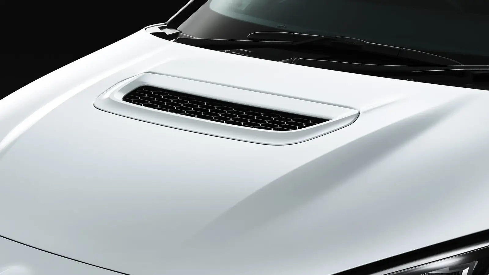 ボンネットの大型冷却ダクトとグリル: 全日本ラリー選手権でヤンチャしまくった経験から得た知識を活かし、エンジン熱の排出を促進する。