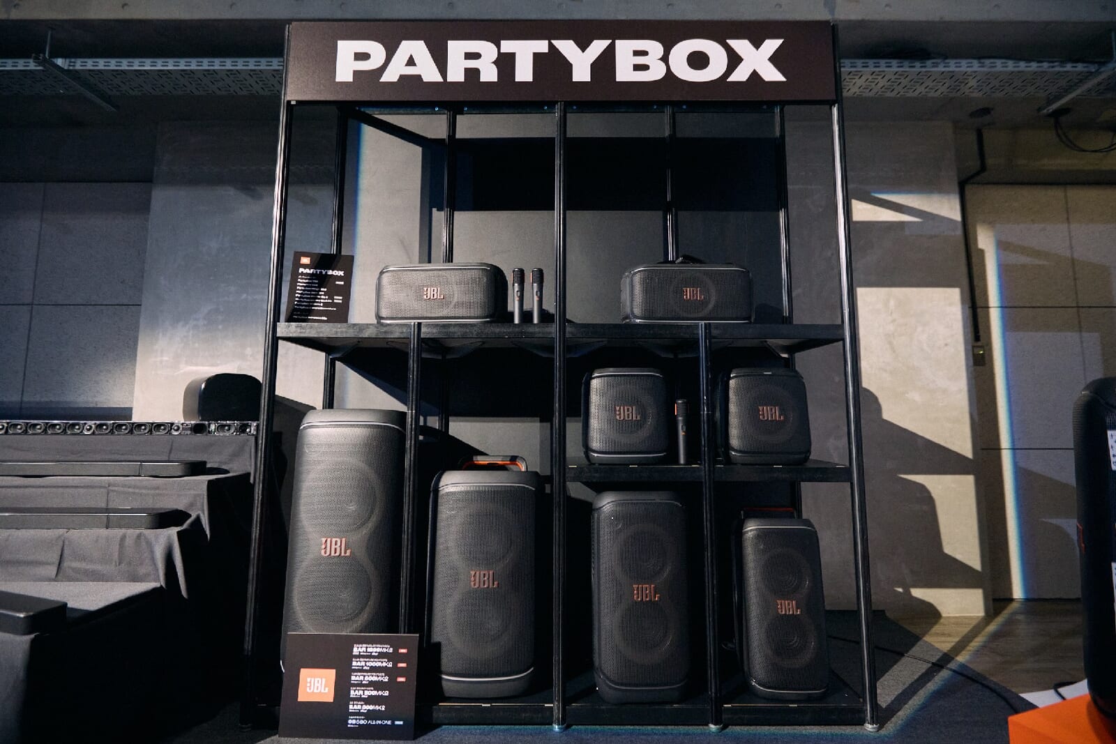 また、参考出品として、特製ハンドルと2本のマイクが同梱された「PartyBox On-The-Go 2」も紹介された。ポータブルカラオケやPAシステムとしても活用できる多目的スピーカーで、今秋5万〜6万円程度での販売が予定されている。