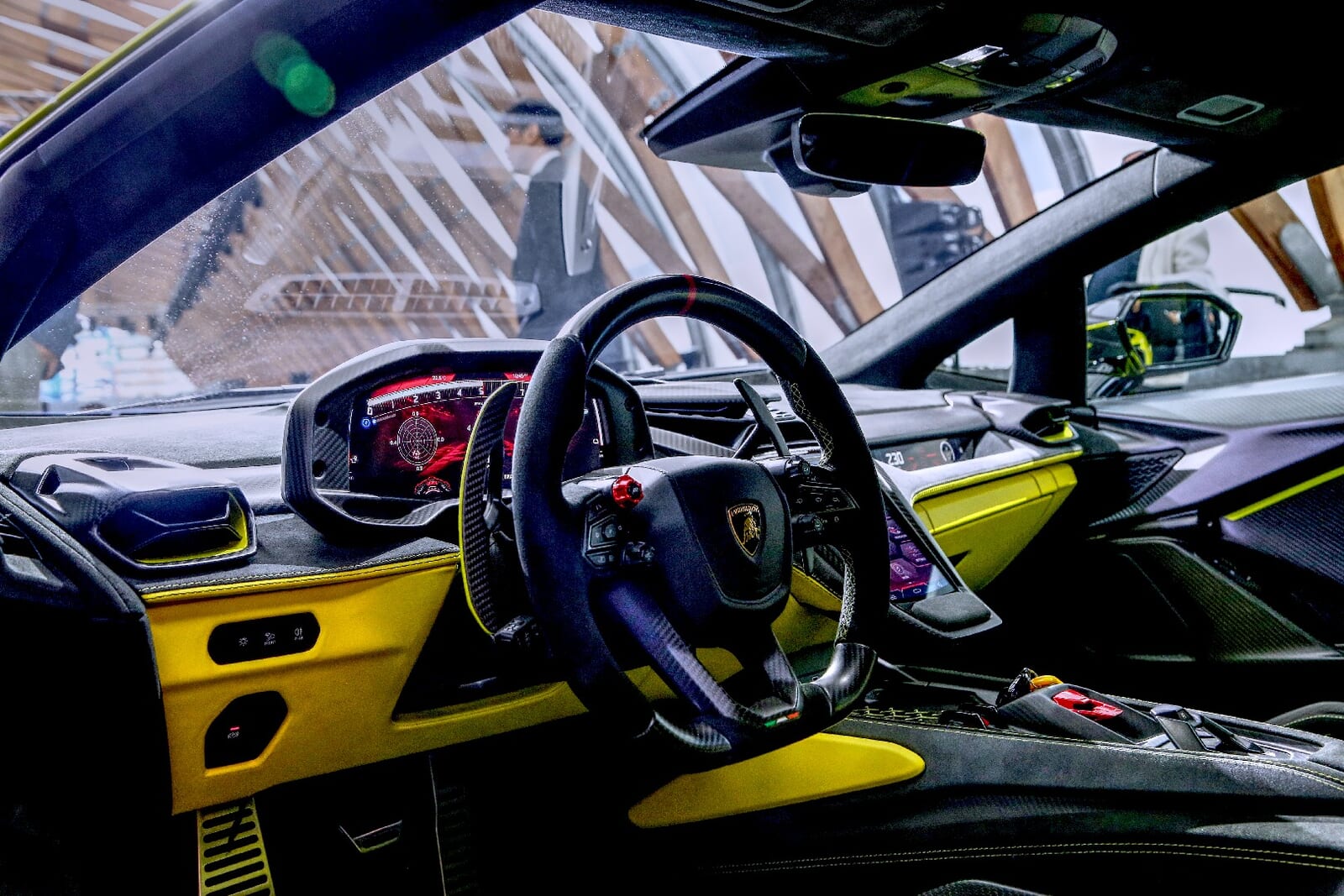 フロントには、レーシングカーであるHuracán GT3を彷彿とさせる巨大なエアインテークが穿たれ、デイタイムランニングライトは猛牛の角をモチーフとしている。ボディ全体は当然のごとくカーボンファイバー製。 サイドのエアインテークは、V12量産モデル比で冷却効率を30%以上も向上させているという。空力も徹底的に磨き上げられた。フロント下部のSダクトは車体下面の気流を整え、ルーフ中央へと導きダウンフォースを生成。リアに備わる可動式ウィングは、ギリシャ文字のΩ(オメガ)のような独特の形状を持ち、高速域での安定性を劇的に高める。そして、ブランドのアイコンである「Y」字モチーフを縦方向に再解釈したリアのライトシグネチャーは、後続車に忘れがたい印象を刻み込むだろう。