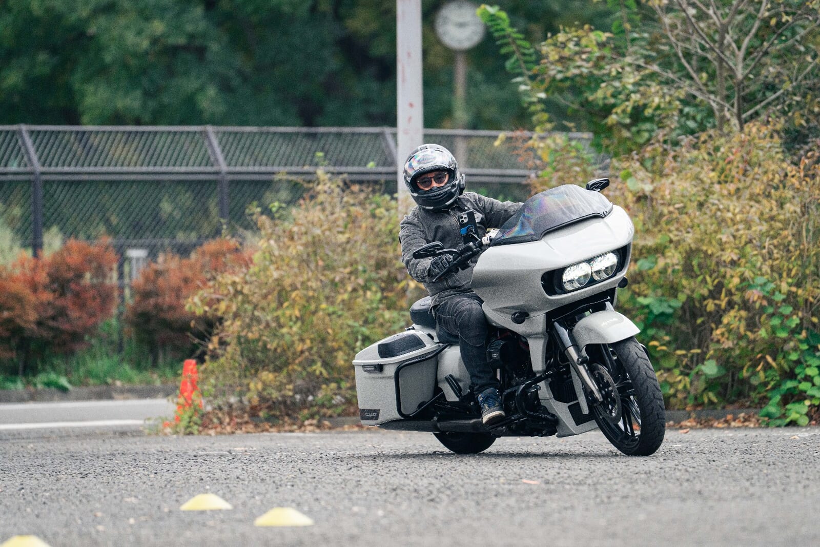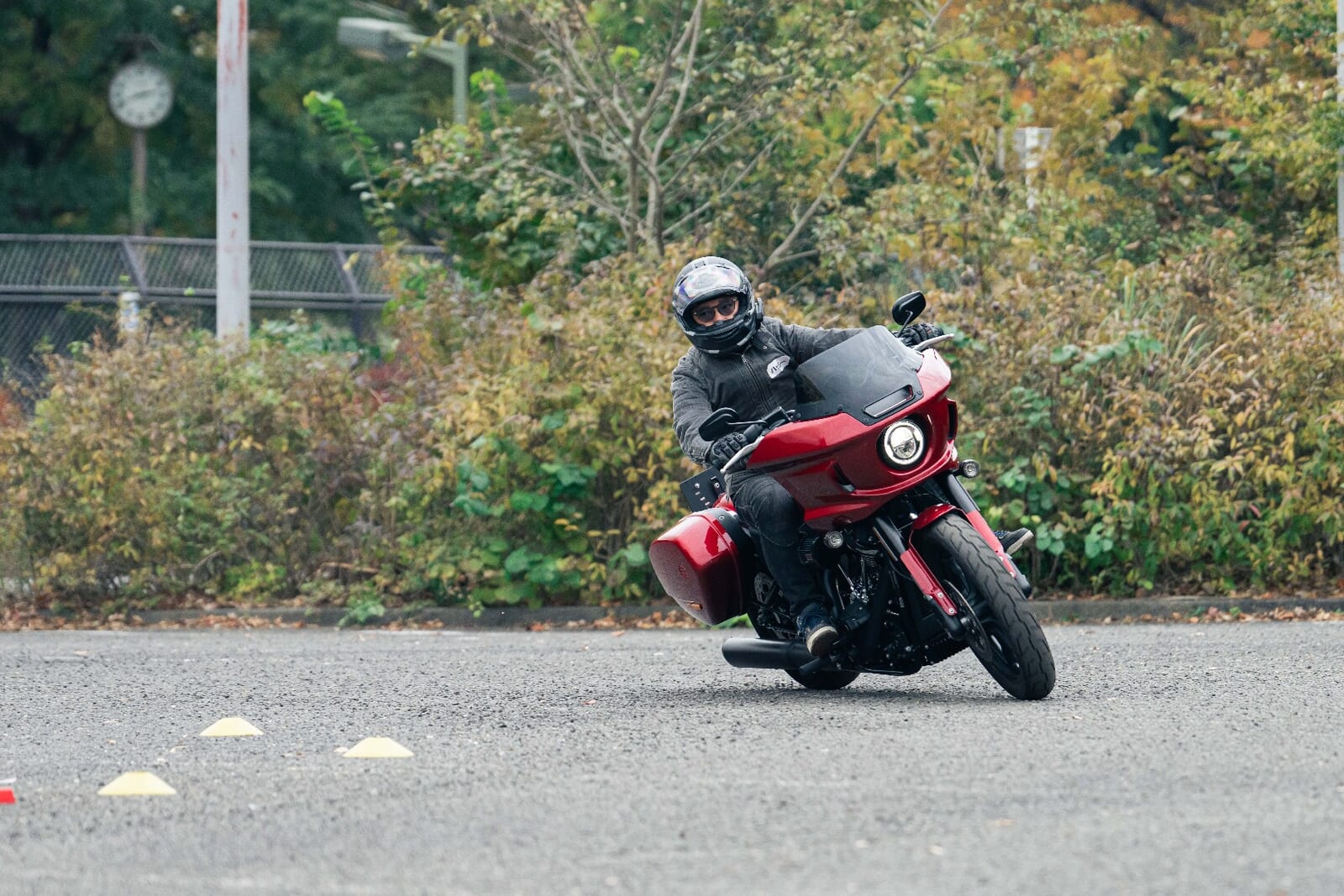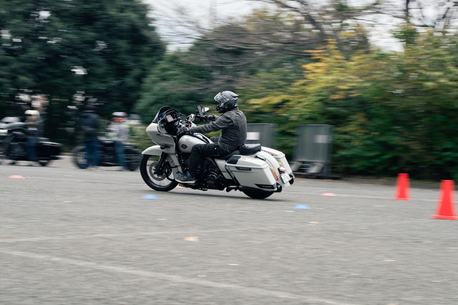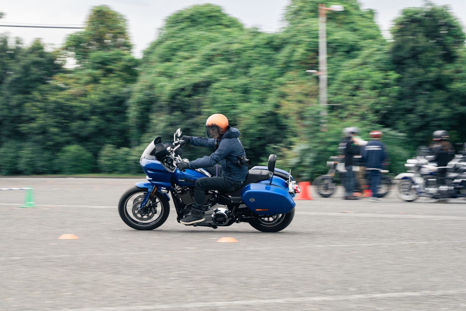 最後は「低速走行」となる。ギアは1速で半クラ状態をキープしながらフットブレーキでスピードをコントロールする。初めて乗る車両なので、どのくらい深く踏むとリアブレーキを引きずる感じになるのか分かりづらかったが、駆動力とブレーキのバランスが取れると車体がピシッと安定することがわかる。低速はクラッチのON/OFFに頼りがちになってしまうが、例えば渋滞時に重いバイクを低速で安定して走らせる姿は、いかにも技術のあるライダーのようでカッコいい。ハーレーはそんなスタイリッシュなライディングスタイルにもこだわっていることがわかる。