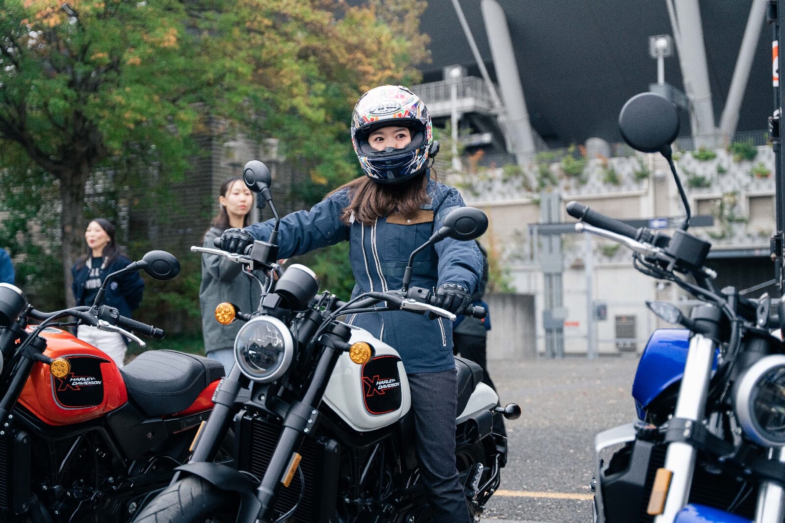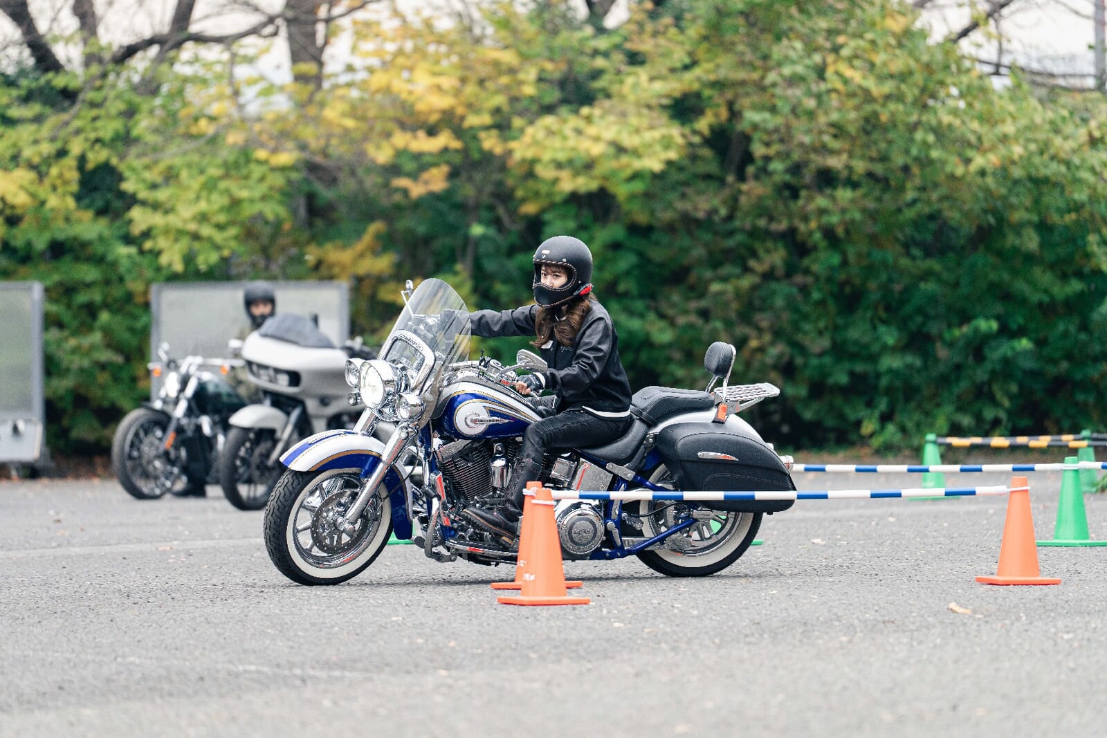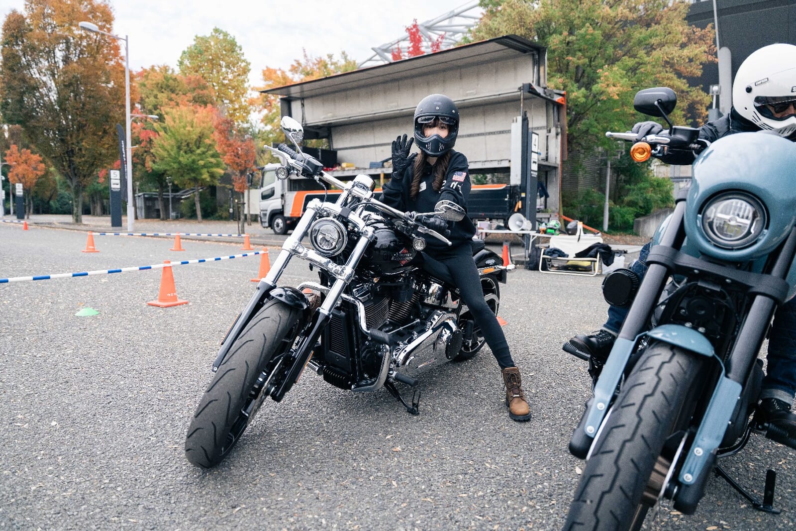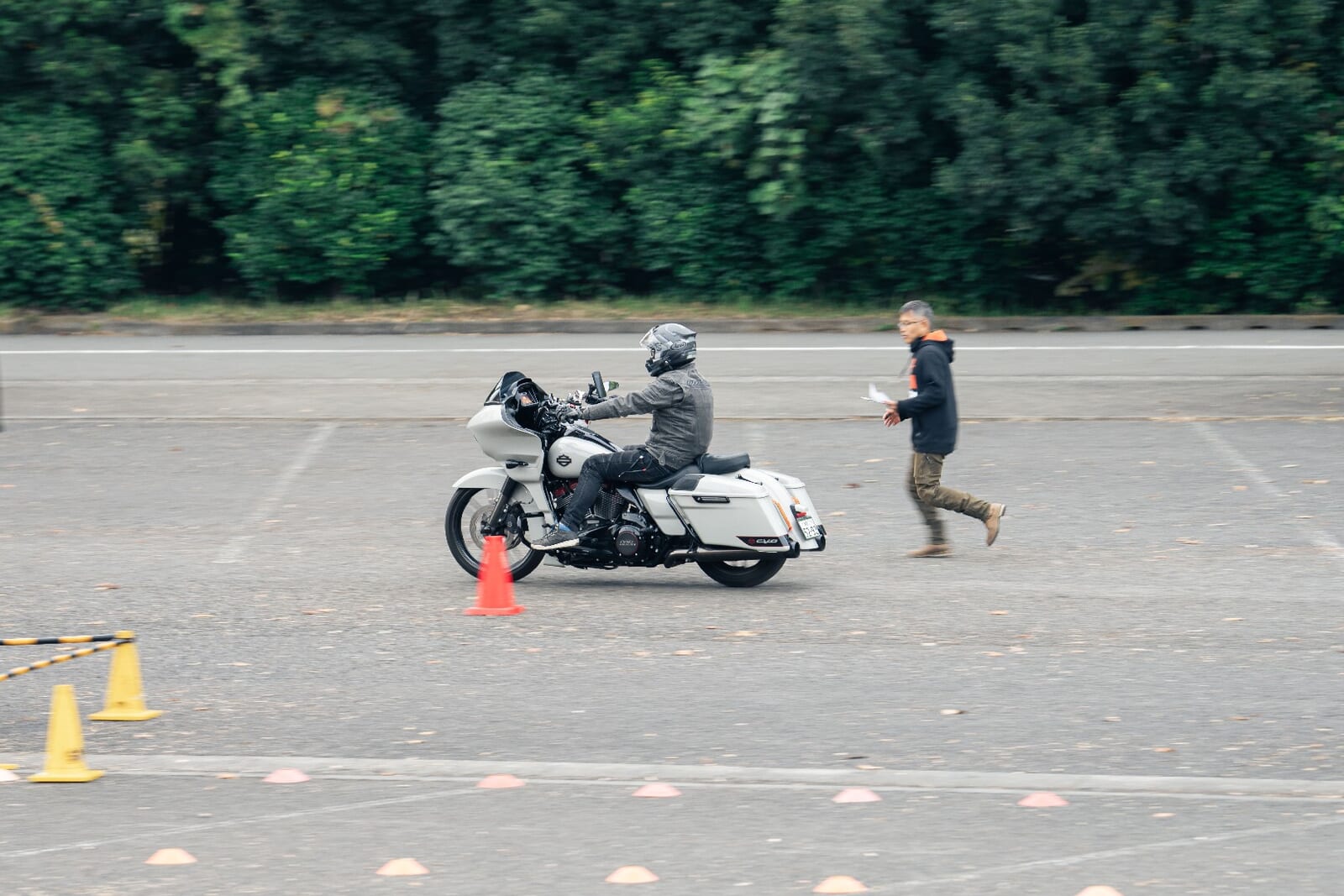 最後は「低速走行」となる。ギアは1速で半クラ状態をキープしながらフットブレーキでスピードをコントロールする。初めて乗る車両なので、どのくらい深く踏むとリアブレーキを引きずる感じになるのか分かりづらかったが、駆動力とブレーキのバランスが取れると車体がピシッと安定することがわかる。低速はクラッチのON/OFFに頼りがちになってしまうが、例えば渋滞時に重いバイクを低速で安定して走らせる姿は、いかにも技術のあるライダーのようでカッコいい。ハーレーはそんなスタイリッシュなライディングスタイルにもこだわっていることがわかる。