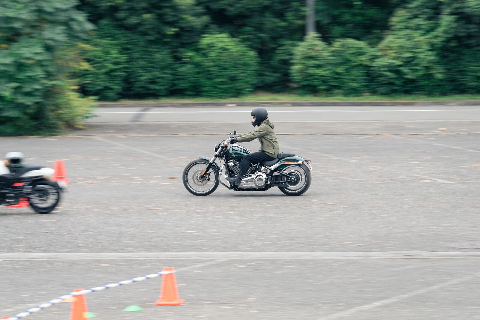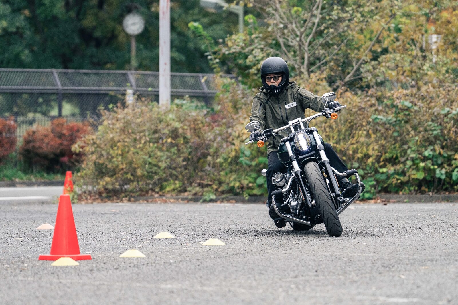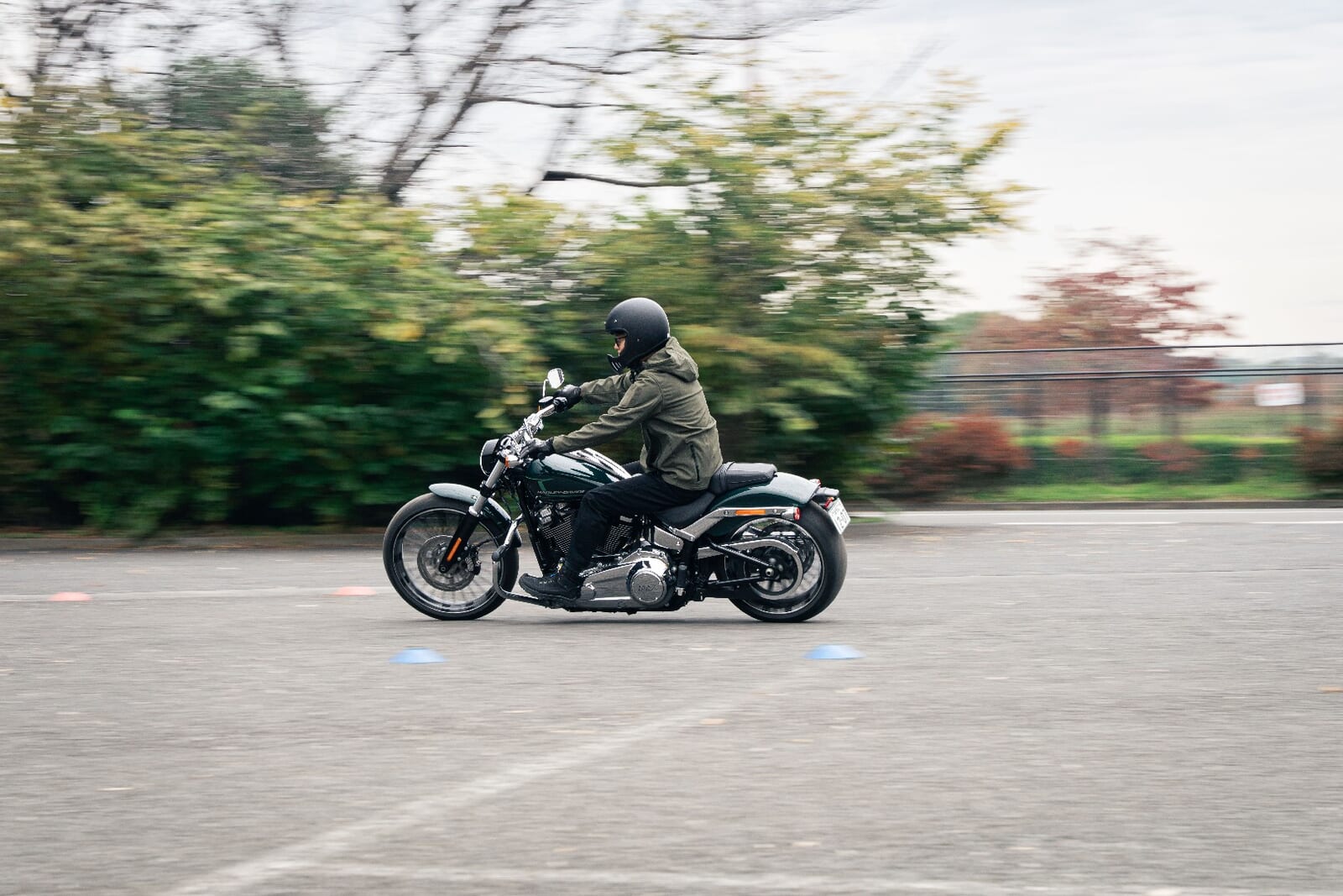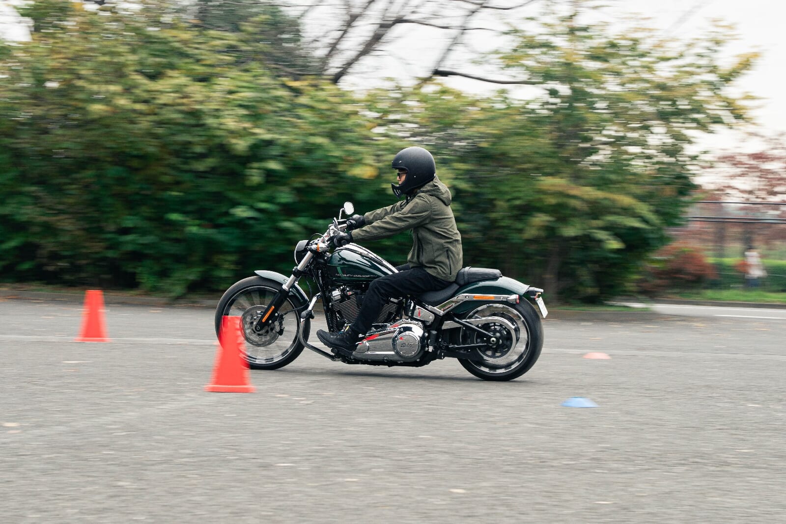 3つめは「急制動」。はじめはリアブレーキのみでABSを体感し、次にフロントブレーキを加え、最終的には前25%、後ろ75%の理想のブレーキングバランスの感覚を掴むというプログラムである。私の乗ったBREAKEOUTのABSは制御が細やかで、以前所有していたモデルの「ガッガッガ」というような無粋な音も立てずに止まる。ハーレーではハンドブレーキまたはフォットブレーキ操作で両輪にブレーキ力を配分する機構であるElectronically Linked Braking(ELB)や、バンク角(車体傾き)を検知し、コーナリング時に前後ブレーキの配分を電子制御するCornering Enhanced Electronic Linked Braking(C-ELB)などが付いているモデルもあるので、いざというときの安心感が高い。この急制動のプログラムでも近くを見すぎるという視点に関するアドバイスを受けた。急制動の先には「障害物回避」というアクションが伴うので広く見ることが大事になる。練習のための練習ではなく、すべてのアクションに実践が想定されている点は、このセクションでも感じることができる。