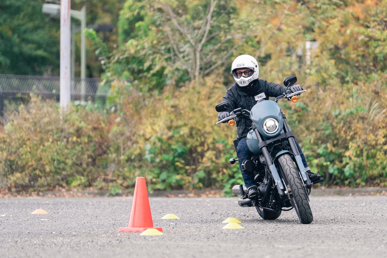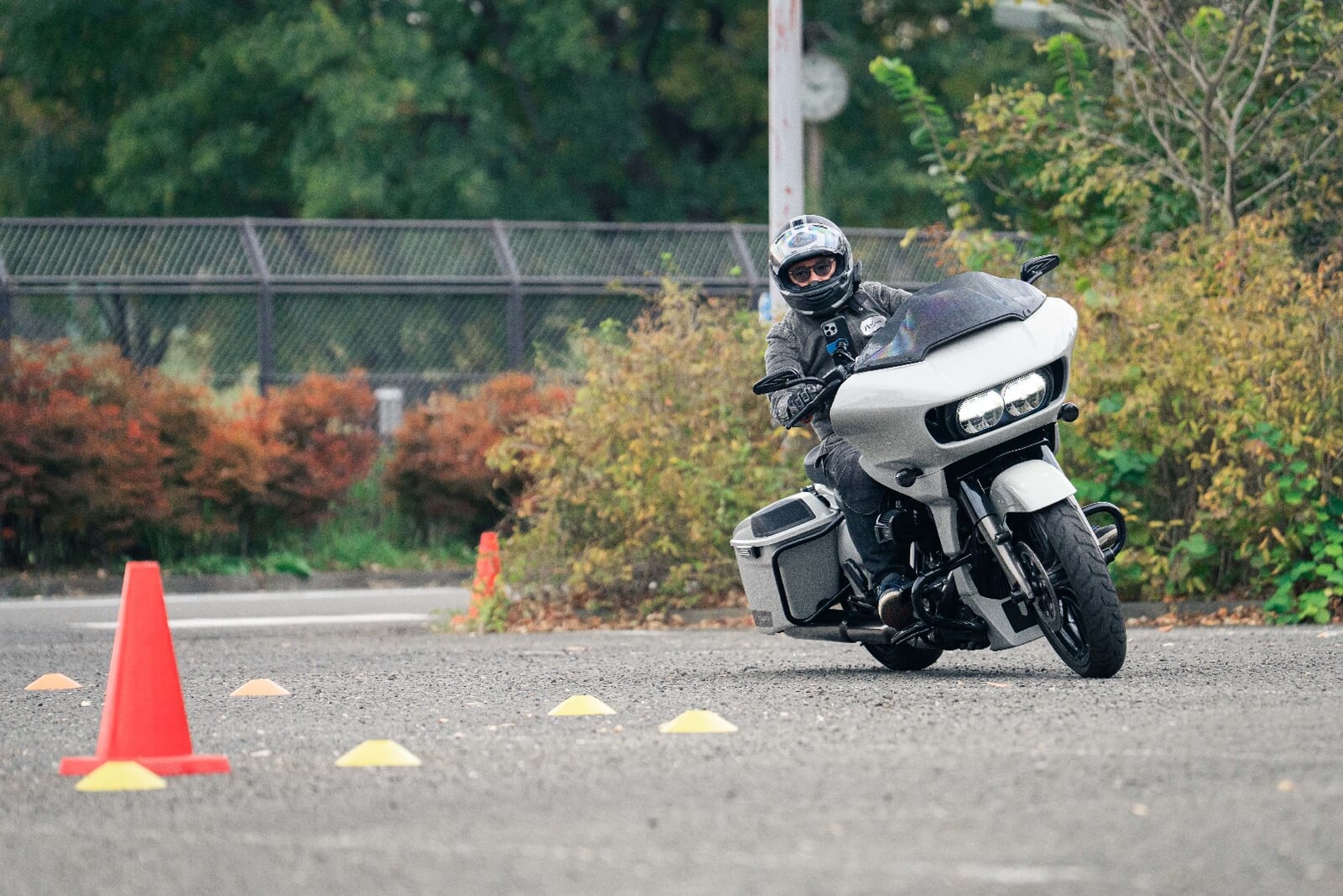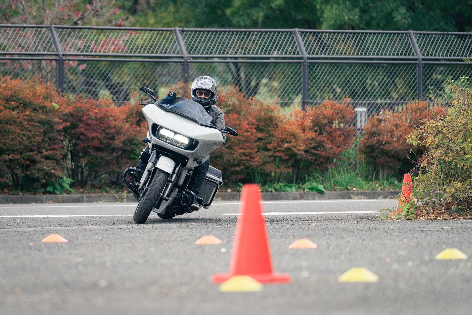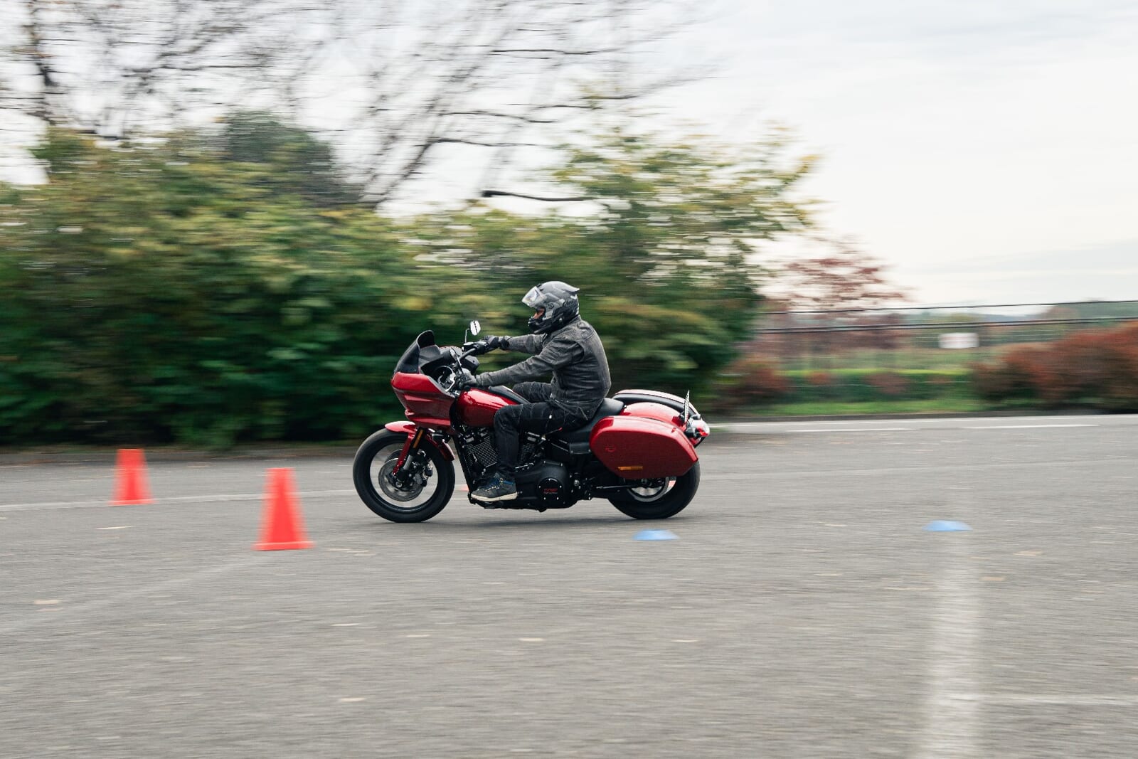 3つめは「急制動」。はじめはリアブレーキのみでABSを体感し、次にフロントブレーキを加え、最終的には前25%、後ろ75%の理想のブレーキングバランスの感覚を掴むというプログラムである。私の乗ったBREAKEOUTのABSは制御が細やかで、以前所有していたモデルの「ガッガッガ」というような無粋な音も立てずに止まる。ハーレーではハンドブレーキまたはフォットブレーキ操作で両輪にブレーキ力を配分する機構であるElectronically Linked Braking(ELB)や、バンク角(車体傾き)を検知し、コーナリング時に前後ブレーキの配分を電子制御するCornering Enhanced Electronic Linked Braking(C-ELB)などが付いているモデルもあるので、いざというときの安心感が高い。この急制動のプログラムでも近くを見すぎるという視点に関するアドバイスを受けた。急制動の先には「障害物回避」というアクションが伴うので広く見ることが大事になる。練習のための練習ではなく、すべてのアクションに実践が想定されている点は、このセクションでも感じることができる。