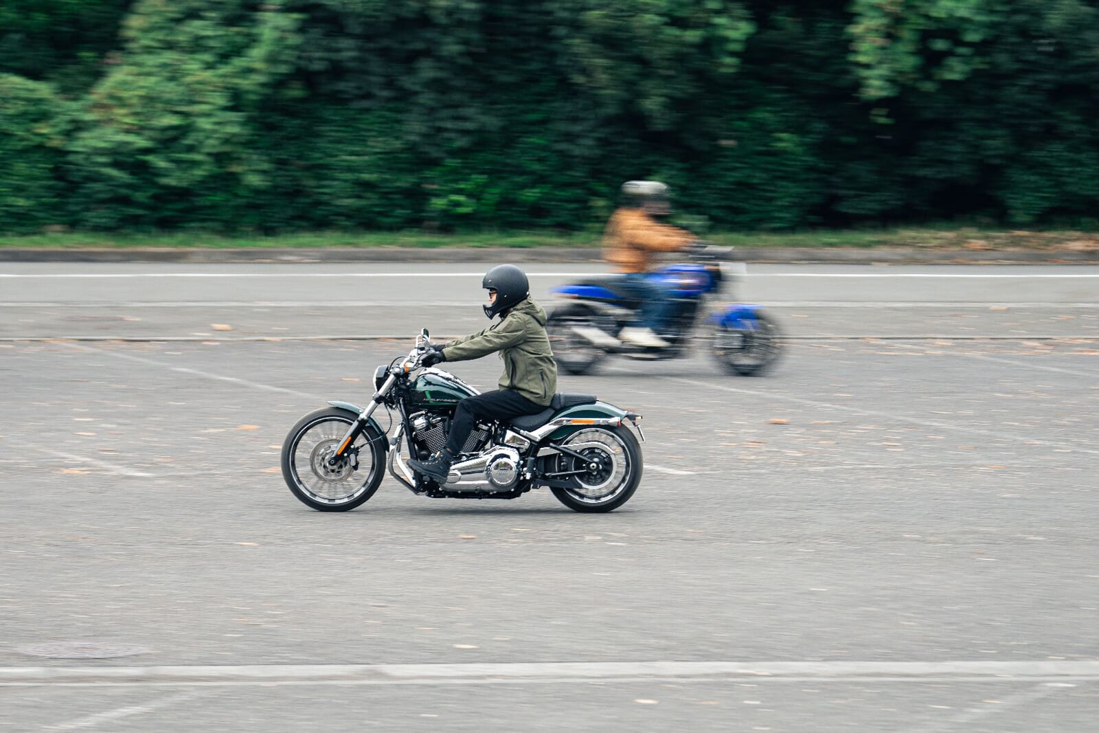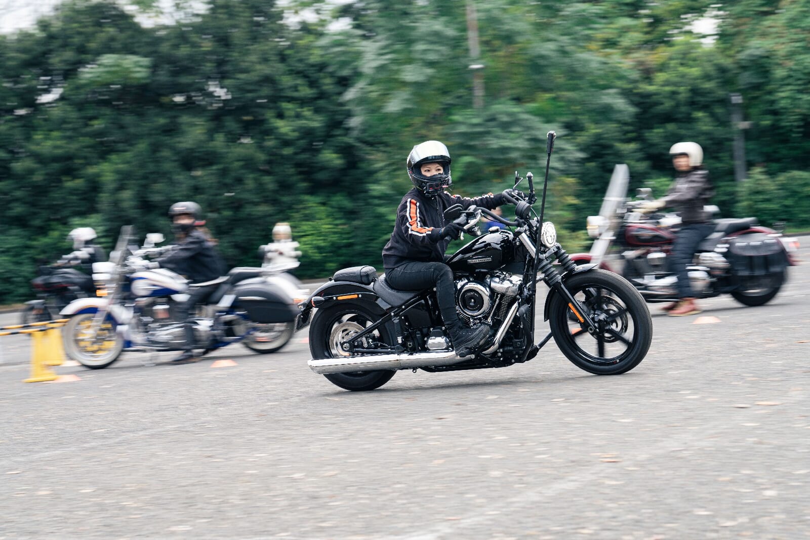 筆者に割り当てられたのは最新のクルーザーモデルである「BREAKOUT」。これまで体験したことのないライディングポジションとその重さに戸惑いながらまずは「8の字・スラローム」に挑むこととなった。コーチの指示は実に明確で、まずは「視線の確認」を徹底する。320kgの巨体を前に、まずは「8の字」という名の試練が与えられる。コーチの指示はただ一つ、「私を見て」。視線を中央のコーチに釘付けにするだけで、あれほど絶望的に思えた巨体が、嘘のように小さく旋回を始める。次に教わったのは、内側の尻にほんの少し力を込めること。大げさな体重移動ではない。ただ、片方の尻の筋肉を意識するだけ。すると、ブレイクアウトはまるで「待ってました」とでも言うように、さらに滑らかに円を描く。これは魔法か? 段々と、この気難しい鉄の塊との対話の仕方が見えてきた。このレベルに併せてちょっとずつヒントを貰えるスタイルもありがたい。段々と仕上がっていく感じが実感できる。