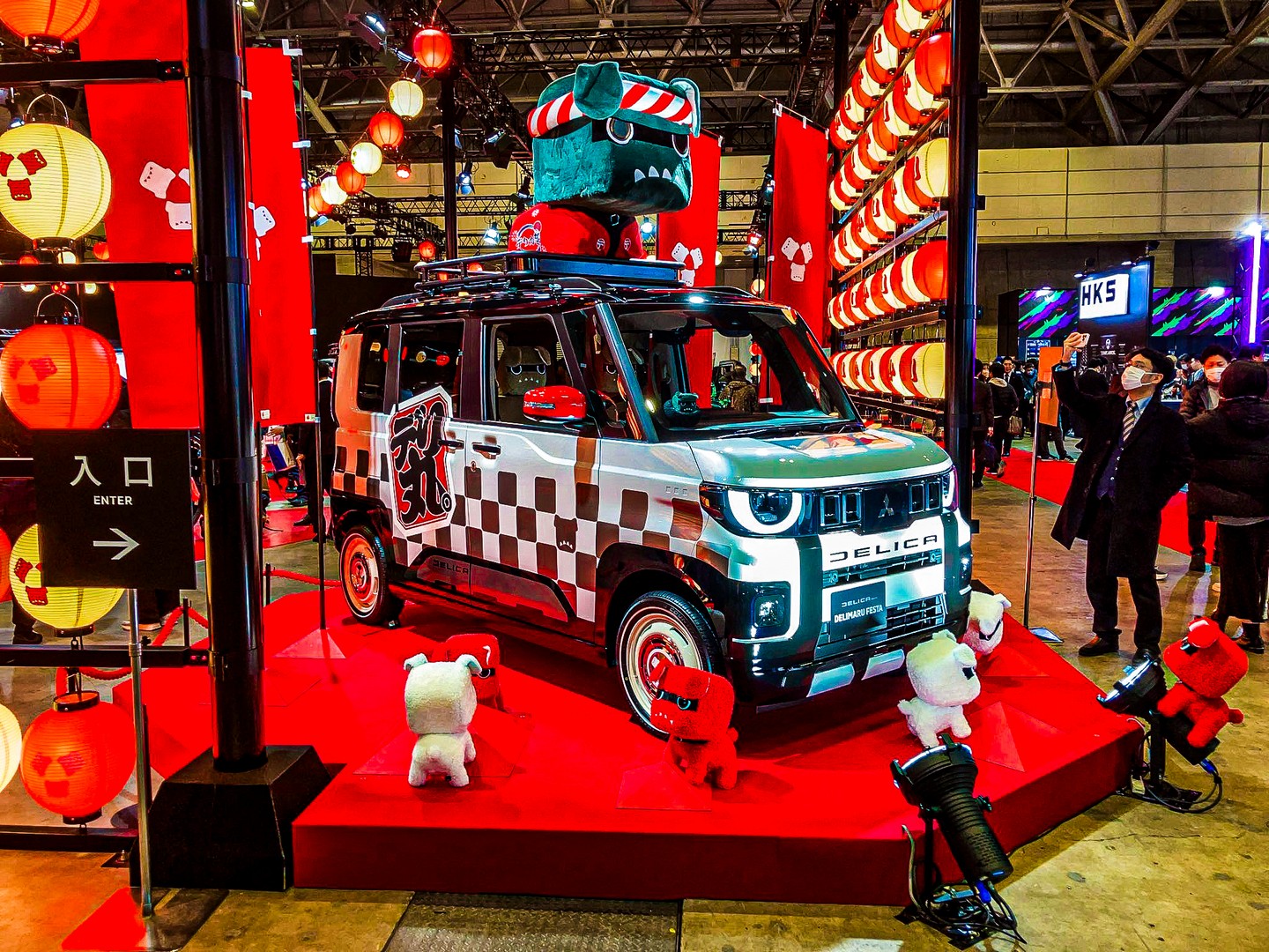 これが東京オートサロンに向けた三菱のラインナップだ。先頭に立つのは「デリ丸。フェスタ(Delimaru Festa)」と名付けられたデリカ ミニで、巨大な「デリ丸。」(日本のCMで話題になったデリカミニの公式キャラクター。愛くるしい犬のような見た目が特徴)で飾られている。どうやらこれは、三菱公式のデリカ ミニ用マスコットらしい。ああ、今なら家族としての類似性が見て取れるな。