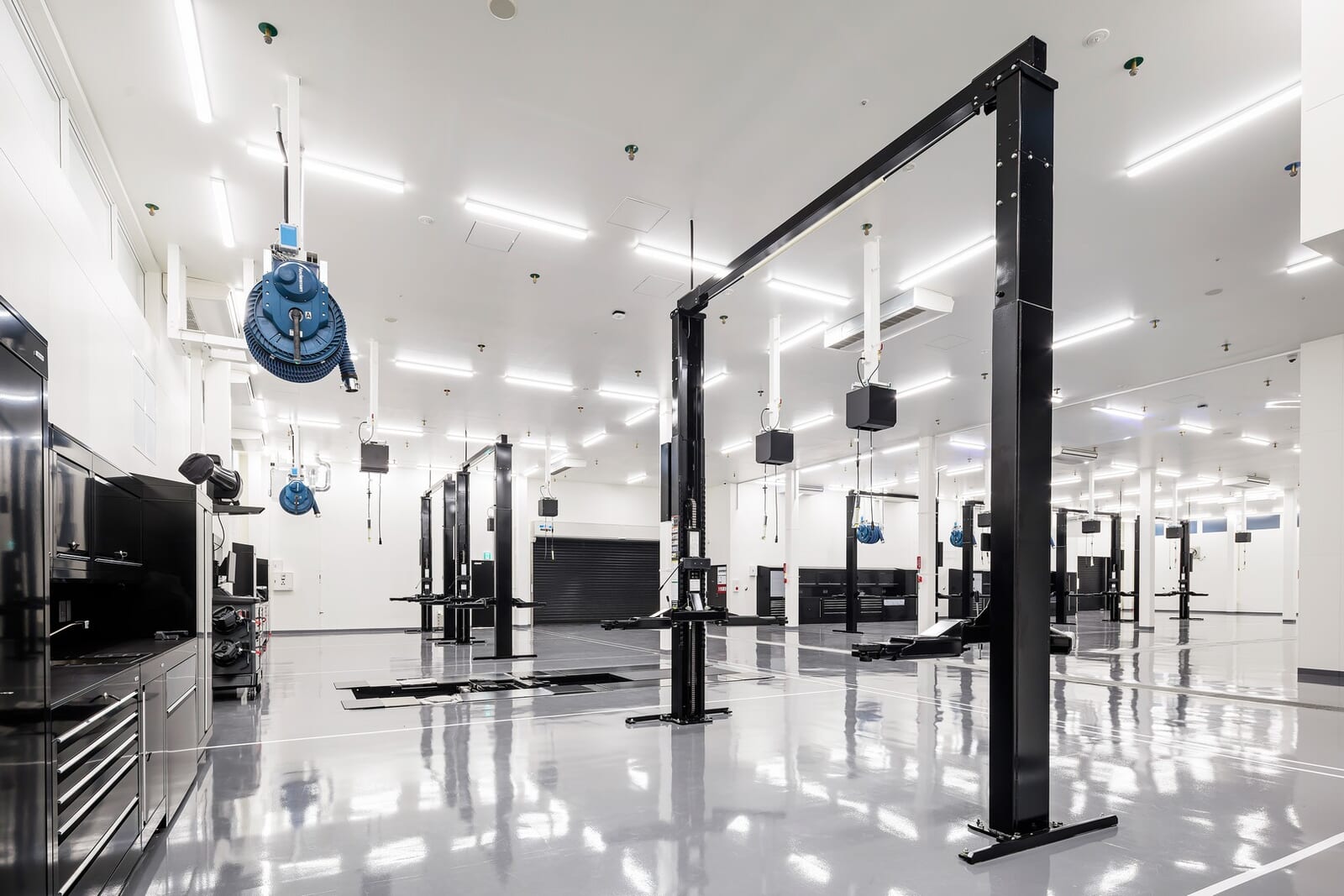 屋内には8つのワークベイ(作業スペース)が整然と並び、7基のリフトと最新のアライメントテスターが鎮座している。