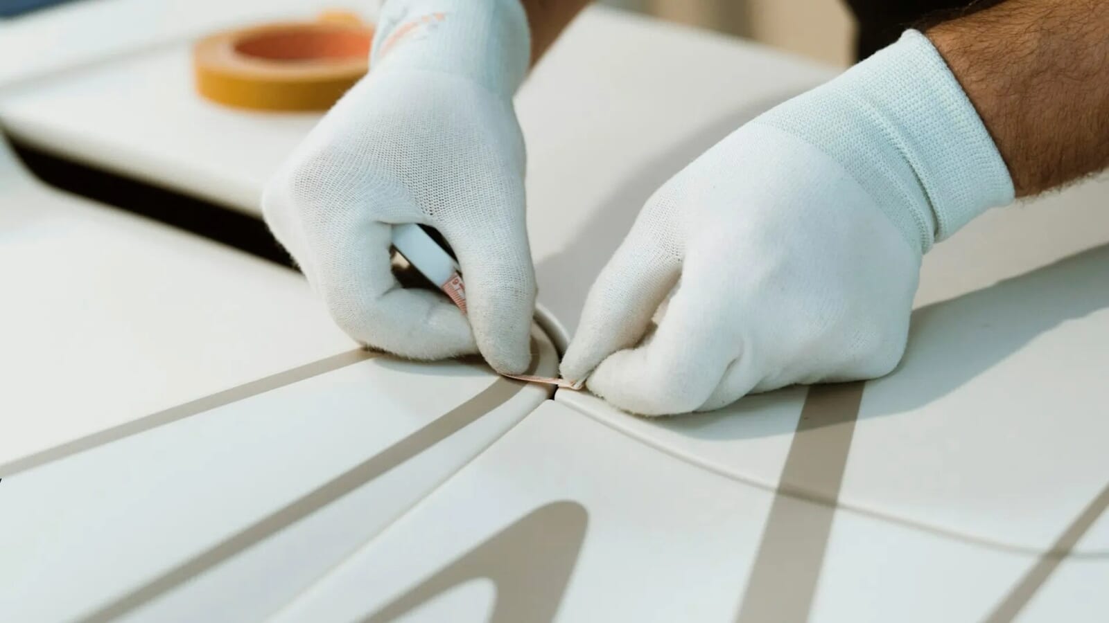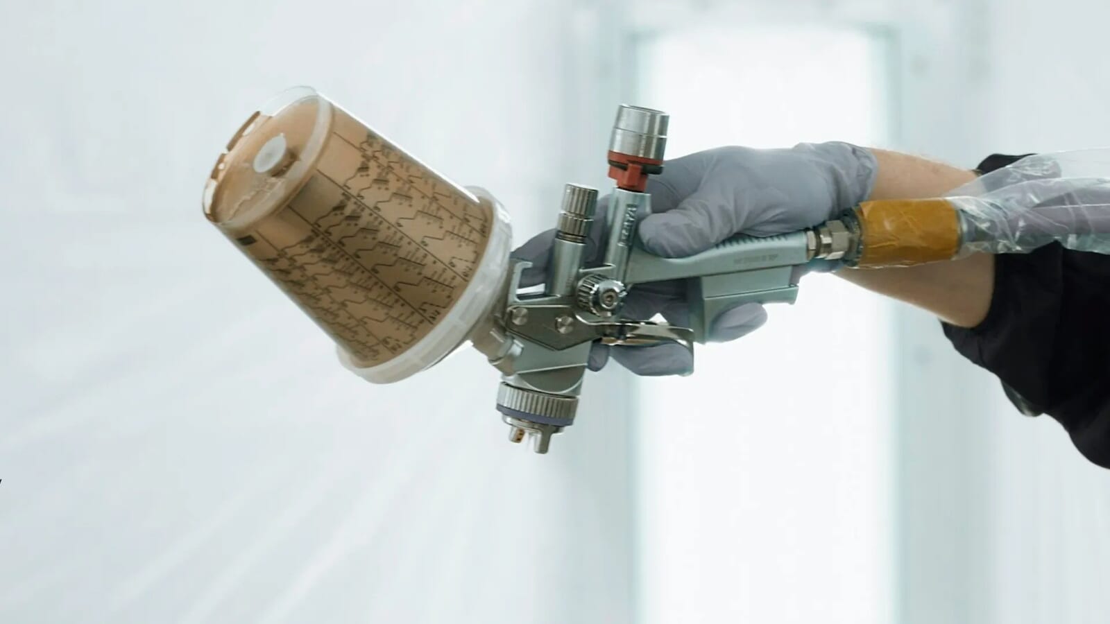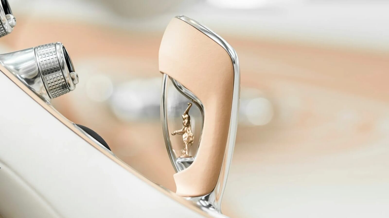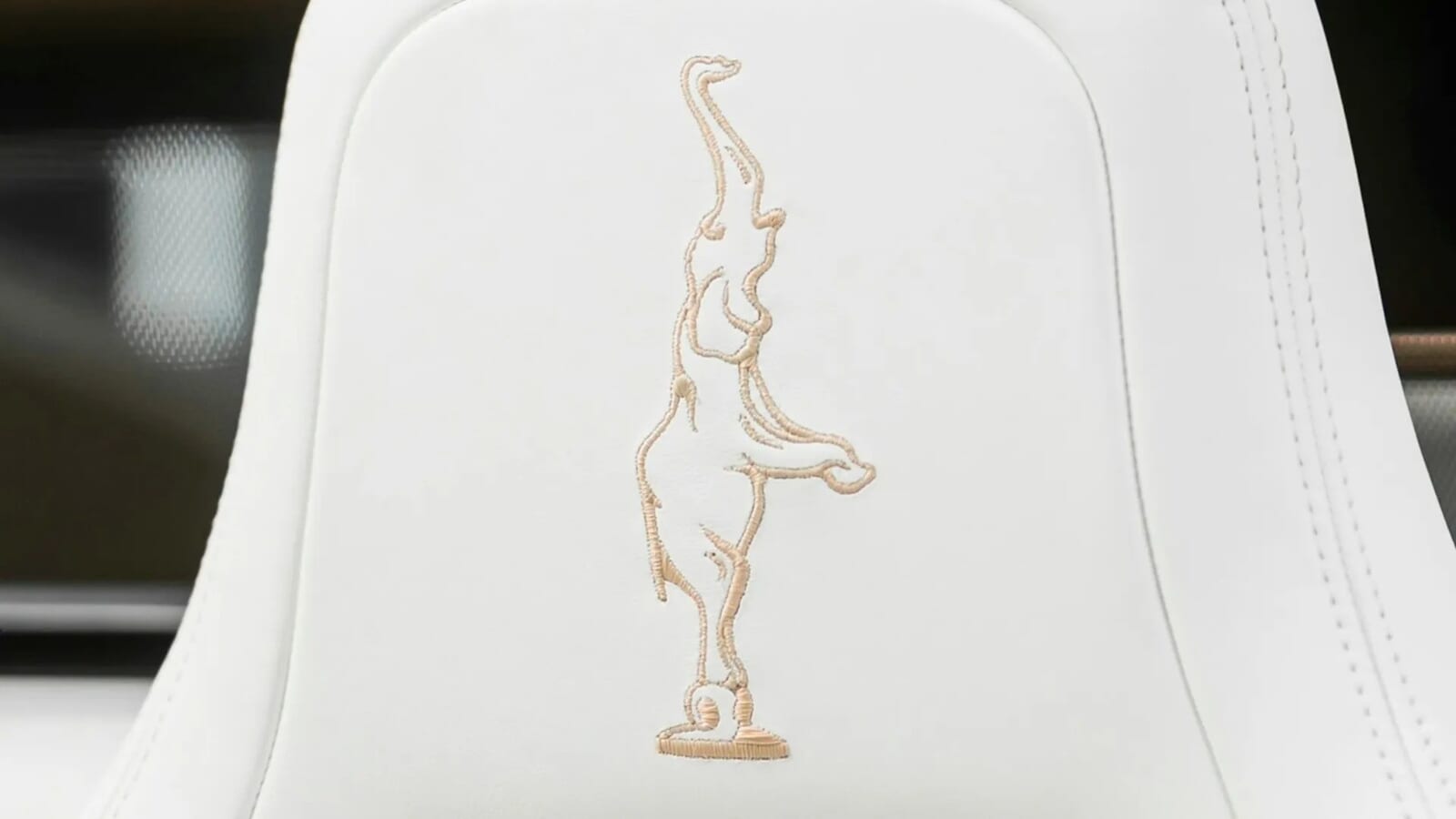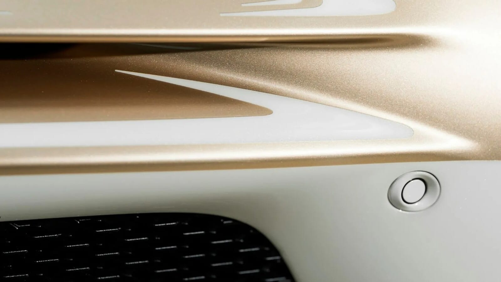 基本的にはツートーンカラーで、様々な色合いのホワイトにメタリックフレークが重ねられている。ゴールドの境界線はミストラルのカーボンファイバー製ボディパネルに手作業で描かれ、アルミホイールも「特別に調合された塗料」で覆われている。
