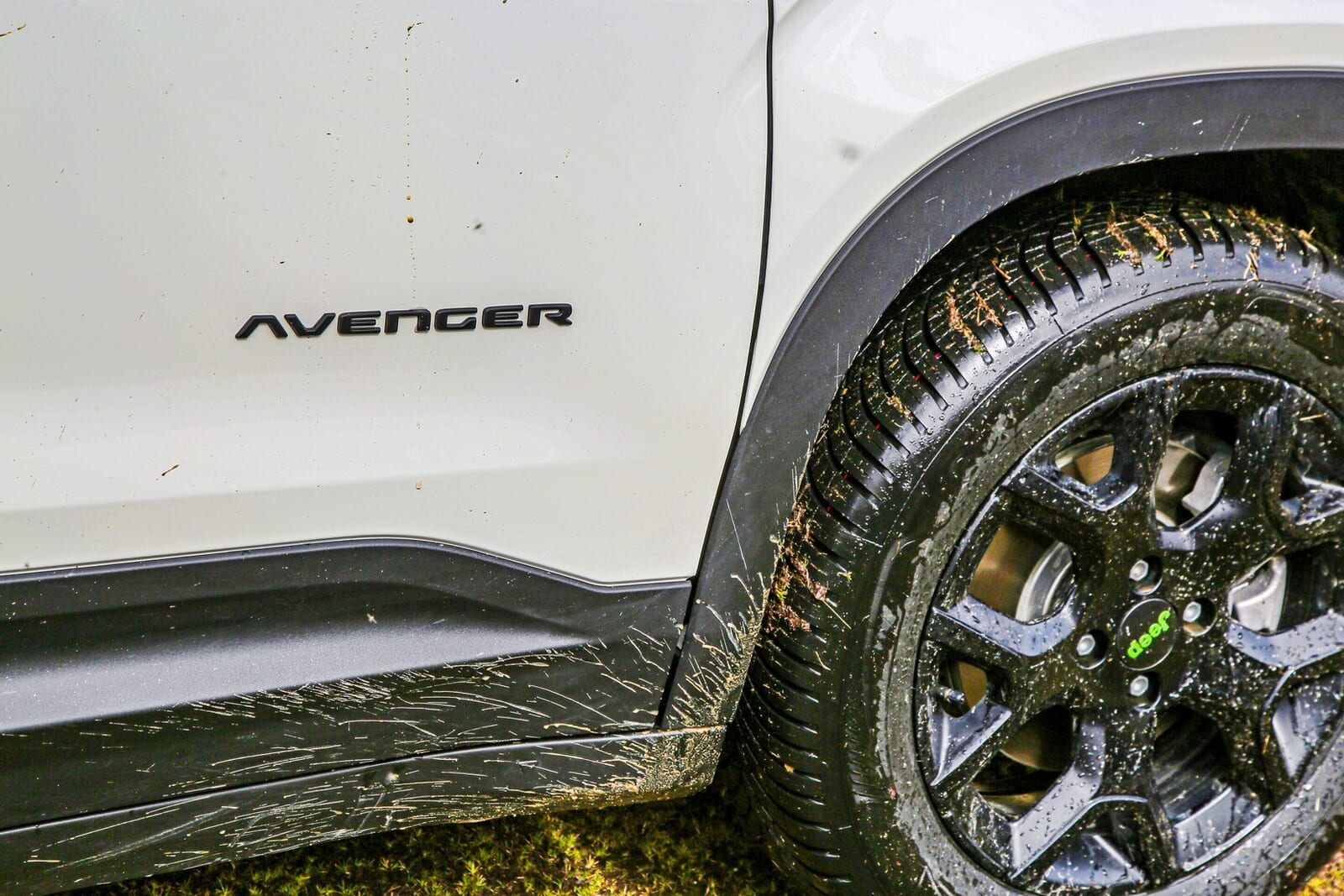 試乗を終え、広場に戻ってきたアベンジャー 4xeは、オケナイト・ホワイトのボディの下半分が泥で真っ茶色に染まっていた。スタッフが高圧洗浄機を持ち出し、勢いよく泥を洗い流していく。