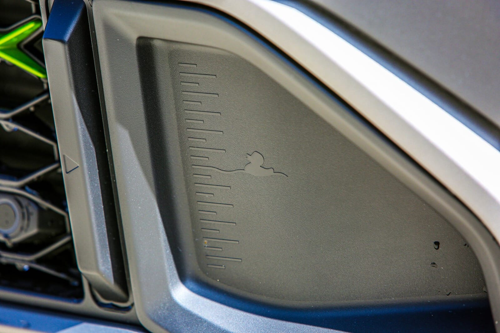 さらに、渡河性能は400mmに達する。フロントバンパーをよく見ると、地上からちょうど400mmの位置にメモリが刻まれ、可愛らしい「ダック(アヒル)」のマークが描かれている。ジープのオーナー同士がアヒルのおもちゃを車に置いていく「ジープ・ダッキング」の文化を取り入れた粋な遊び心だが、これは同時に「このアヒルが溺れない高さまでは、水に突っ込んでも生還できる」という実用的な警告でもある。