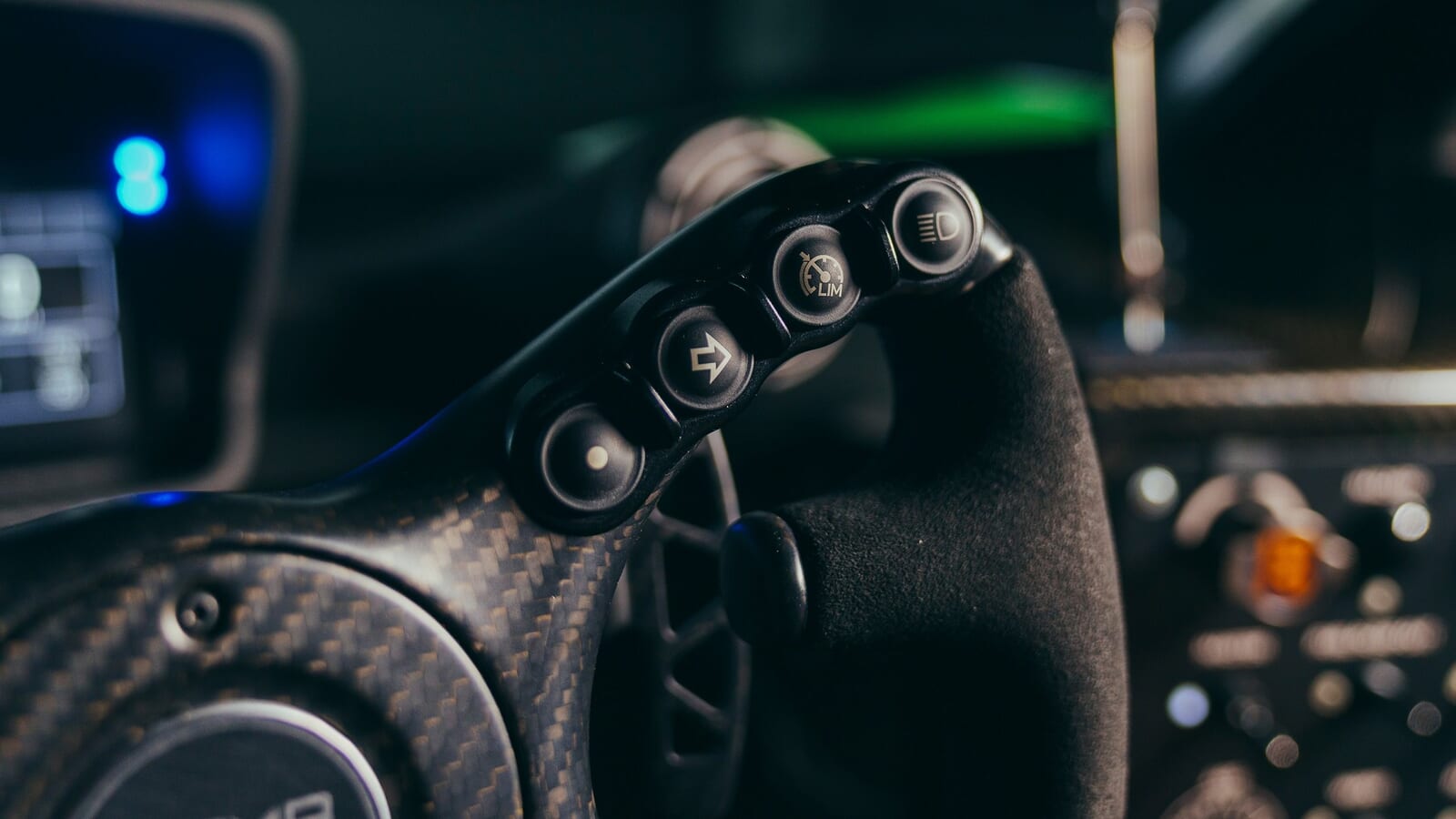 目の前には、小さなカーボンファイバー製でバットシグナル(※バットマンのロゴ)のような形状のヨーク(※操縦桿型ステアリング)があり、左側のウイング上部に3つ、右側に4つのボタンが配置されている。これらは、インターコム、ウィンカー、ウォッシャー/ワイパー、スピードリミッター、ヘッドライトを操作するためのものだ。ハブの左下にはサムホイール(※親指で回すダイヤル)があり、目の前のデジタルディスプレイの画面をスクロールできる。機能的だが、現代のF1マシンやレーシングプロトタイプ、あるいはかなりの数の公道走行可能なスーパーカーと比較すると、シンプルで落ち着いている。そして、その感触も素晴らしい。