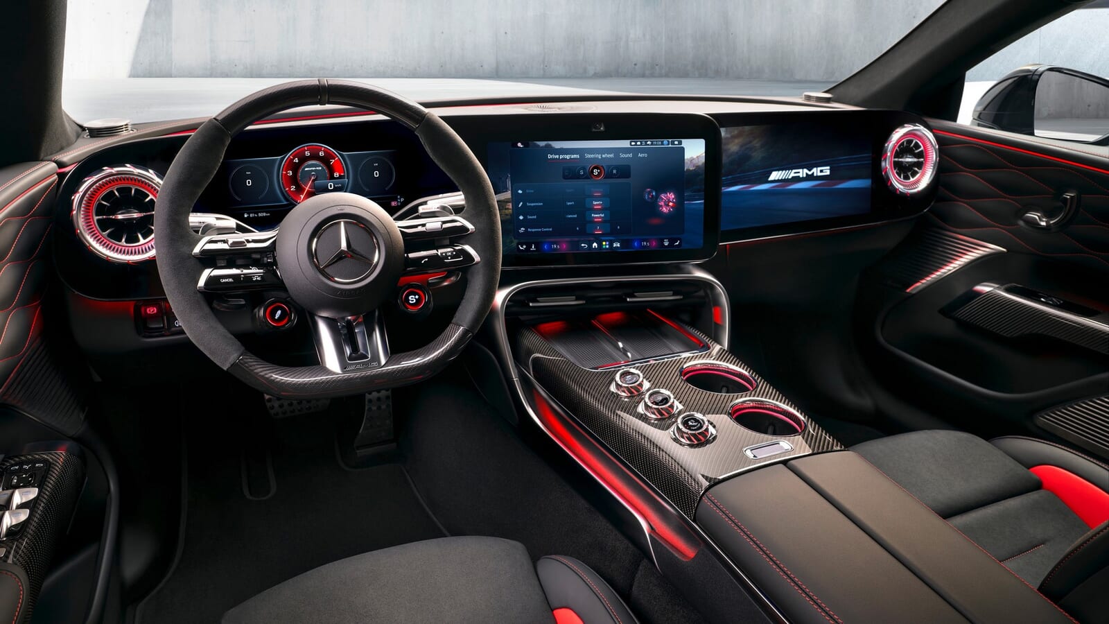 興味深いことに、これらスクリーンはダッシュボードを「支配」しているにもかかわらず、AMGの広報資料の中では脇役(セカンドビリング)に甘んじている。なぜなら、彼らが本当に焦点を当てているのは、この4ドアクーペのダイナミクス(※走行特性)を変化させる3つのロータリーダイヤルの方だからだ。