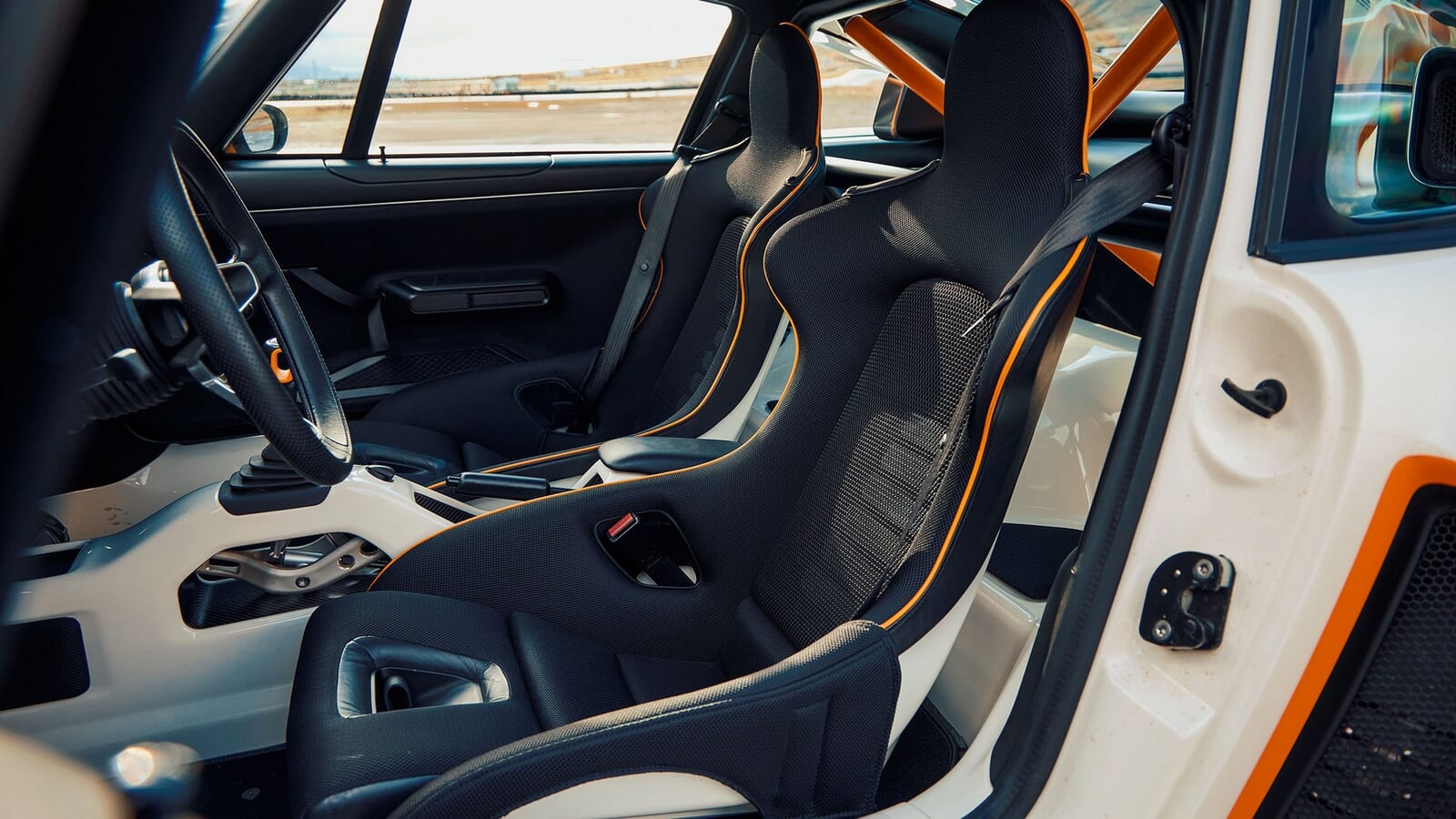 緊張を和らげてくれるのはキャビンだ。シンプルそのもの。スクリーンも混乱もない。手動のウィンドウ、非常にシンプルなヒーター操作、ステアリング調整なし、そして3つのペダル。オリジナルの964オーナーが唯一違和感を覚えるのは、モードダイヤルくらいだろう。ゲート式のギアレバーの後ろにある、このロータリースイッチがボッシュの膨大な制御技術を凝縮している。