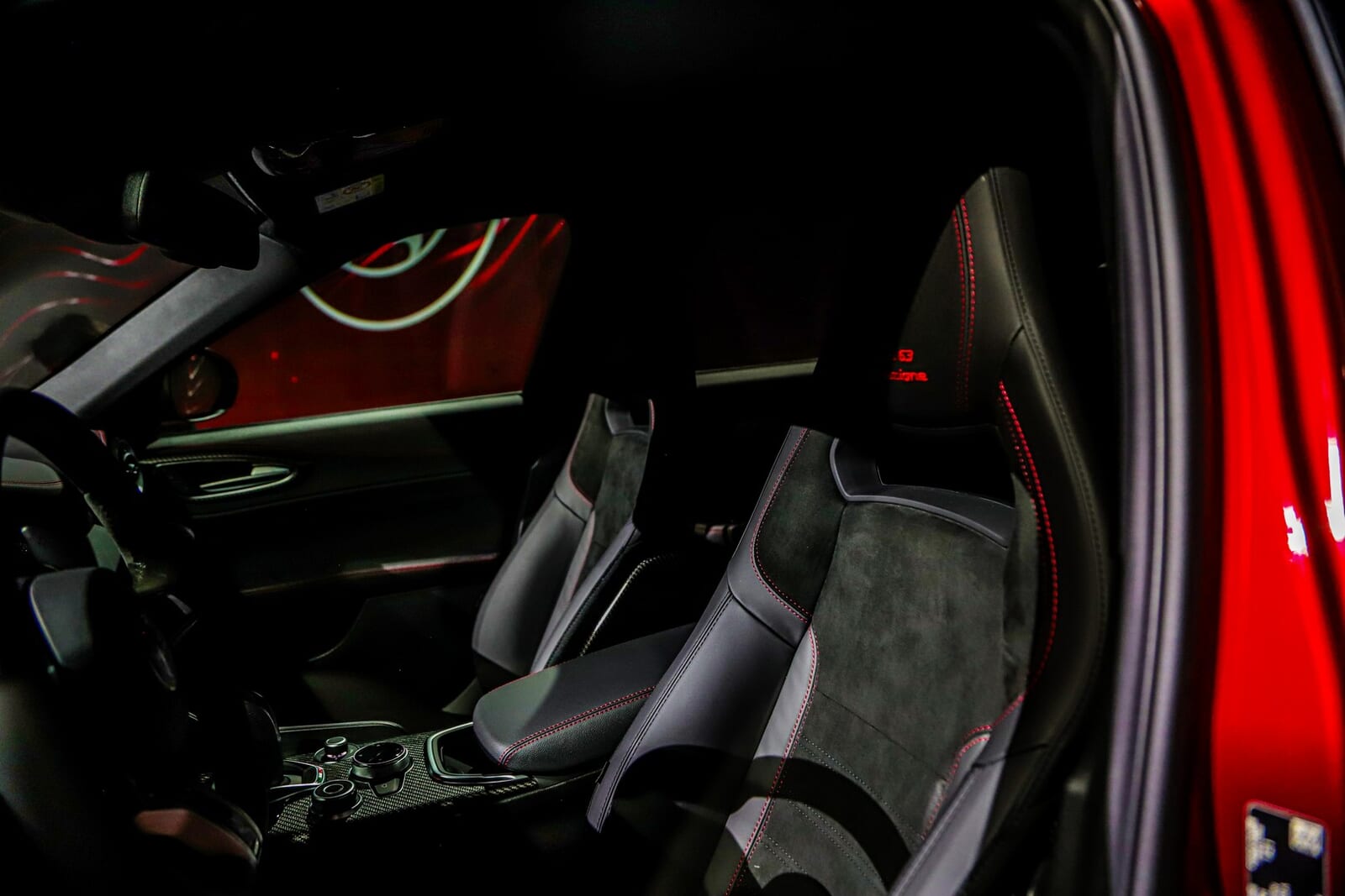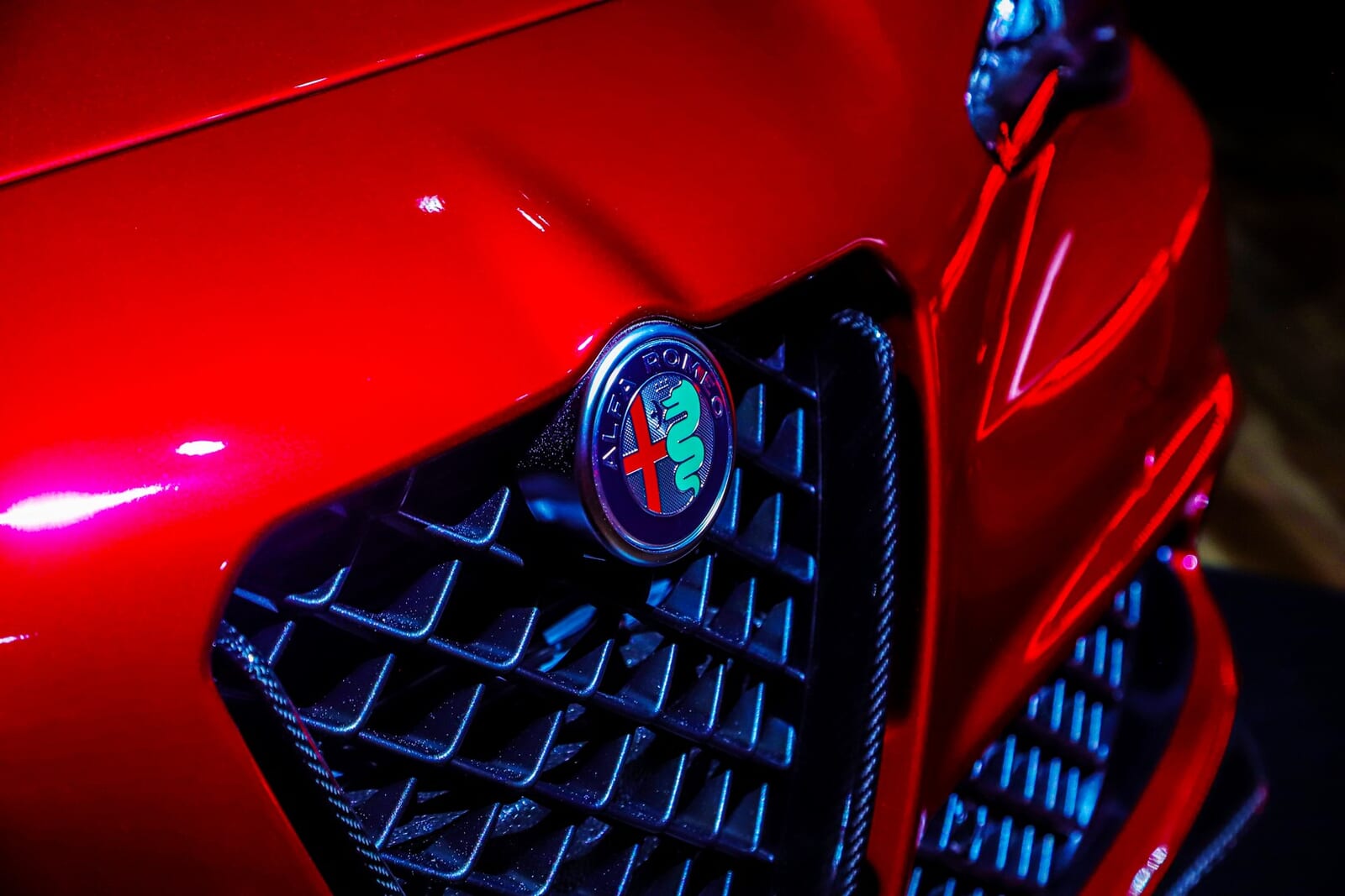 驚くべき色彩哲学だ。屋内の日陰で見ると、マフィアのスタッフカーのように黒っぽく沈み、威圧的なオーラを放っている。しかし、太陽の光が射し込んだ瞬間、ボディのプレスラインに沿って鮮やかで深みのある「緑」が爆発するのだ。随所にブラックのアクセントが効いたエクステリアと、伝統的な三葉ホイールが、既存の口うるさいアルファファンの心を強烈に突き刺すことだろう。
