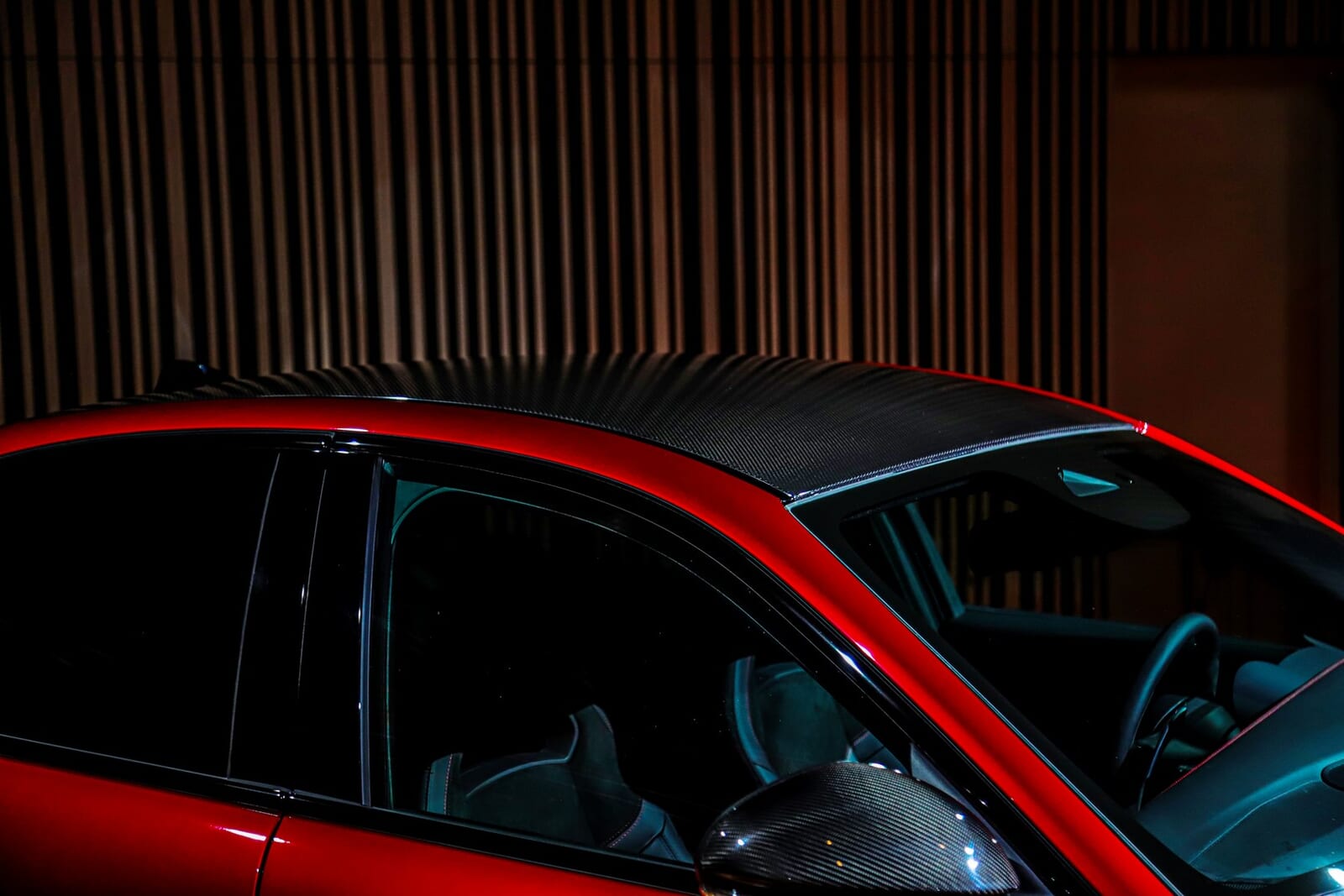 そしてもう1台は、世界限定わずか63台(日本にはジュリアが11台、ステルヴィオが2台のみ)という超弩級のモンスター「Quadrifoglio Collezione(クアドリフォリオ コレッツィオーネ)」だ。1963年の名車「Giulia Ti Super」に敬意を表したこのモデルは、伝説の「33 Stradale」をルーツとする深紅のボディカラー「Rosso Villa D'Este(ロッソ・ヴィッラ・デステ)」を纏っている。Brembo製カーボンセラミックブレーキの奥には、Akrapovic(アクラポビッチ)製のチタンマフラーが控えている。520馬力を叩き出すV6ツインターボの高く乾いた咆哮が、静かな会場の中で今にも聞こえてきそうだった。