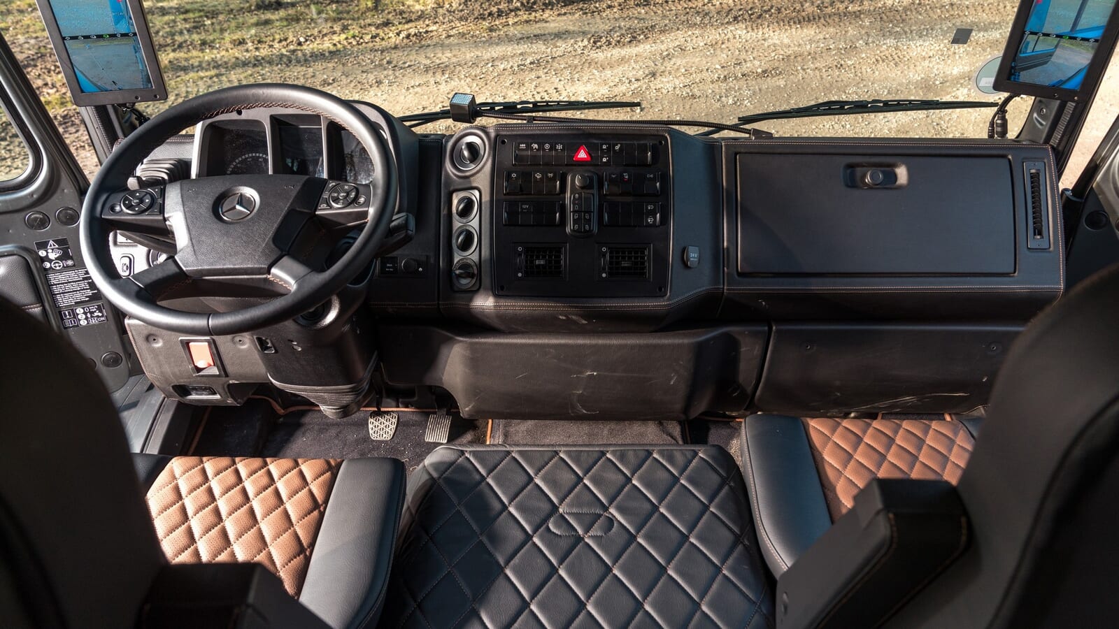 それが如実にわかるのは、通常のウニモグと同じく、巨大なステアリングホイールを握った瞬間だ。ほぼ水平に寝かされており、実用一点張りのドライバー用メーターパネルに向かっている。センターコンソールも標準のままだ。プラスチック製でボタンだらけ。ローレンジ用のボタン、パワーウィンドウ、各種ライト、そして3つのデフロック用ロータリーダイヤル。非常に実用的な散文の世界だ。ローレット加工(滑り止め)されたパーツはどこにもない。