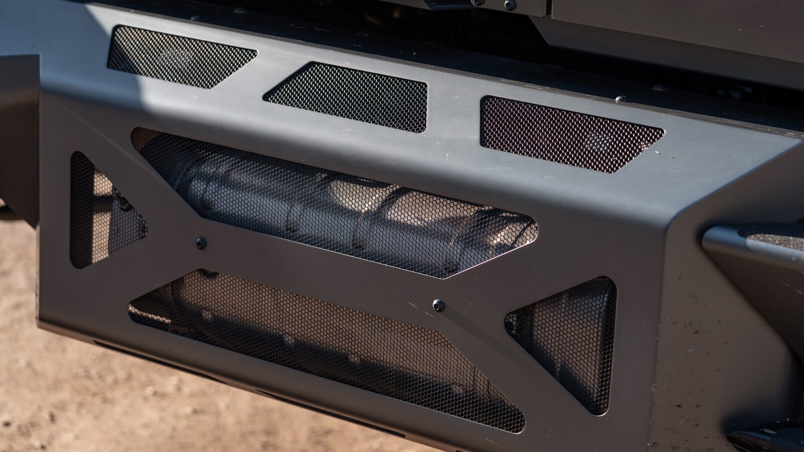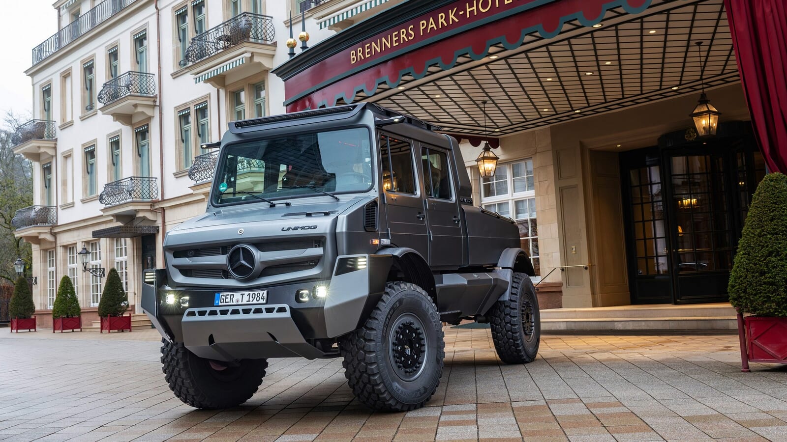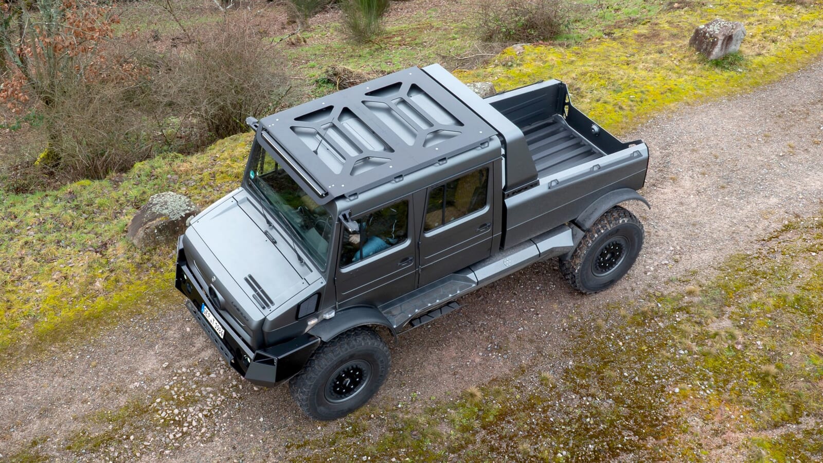 だが、このコンセプトモデルはそれ以上だ。ウニモグの無骨な作業着スタイルに、カルバン・クラインのような洗練を少しだけ加えたマットグレーの塗装が施されている。スタイリッシュなルーフラック(高さ3.6mの位置にあるので荷物を積むのは不可能に近いが)、世界で最も太いロールフープ、巨大なライトバー、前後LEDライト、最新トラック譲りのデジタルミラー、そして戦艦並みのスキッドプレートまで完備。