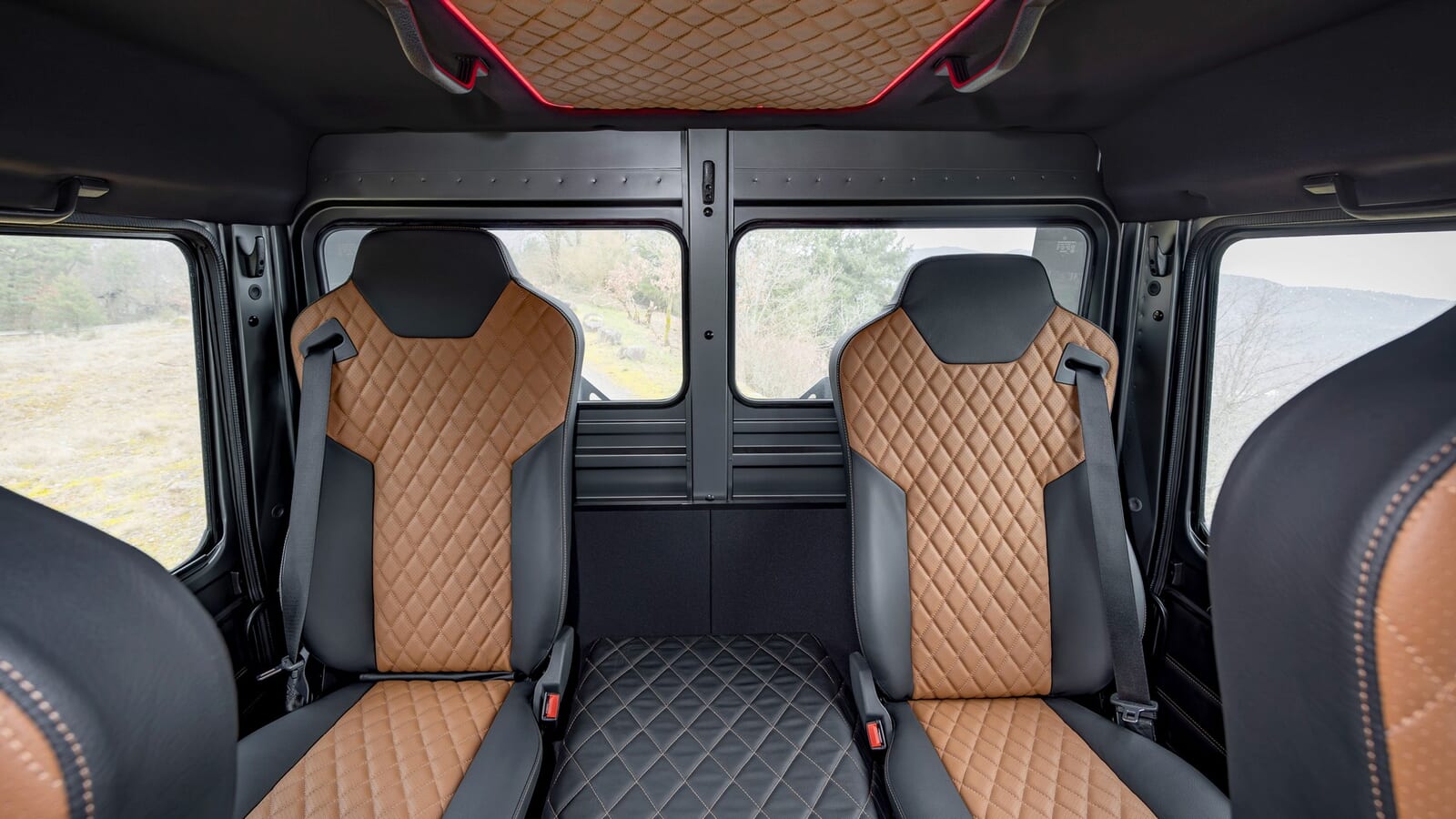 まあ、そう言える。ウニモグの通常の内装と比較すれば、高級と言っていい。マイバッハのエンジニアが今すぐ口出ししたくなるレベルではないが。基本的には、キルティングレザーのエアサスペンション付き電動シートが4脚ある。ただ、これは通常のウニモグにもあるシートに飾りを付けただけで、快適ではあるが複雑な仕掛けはない。