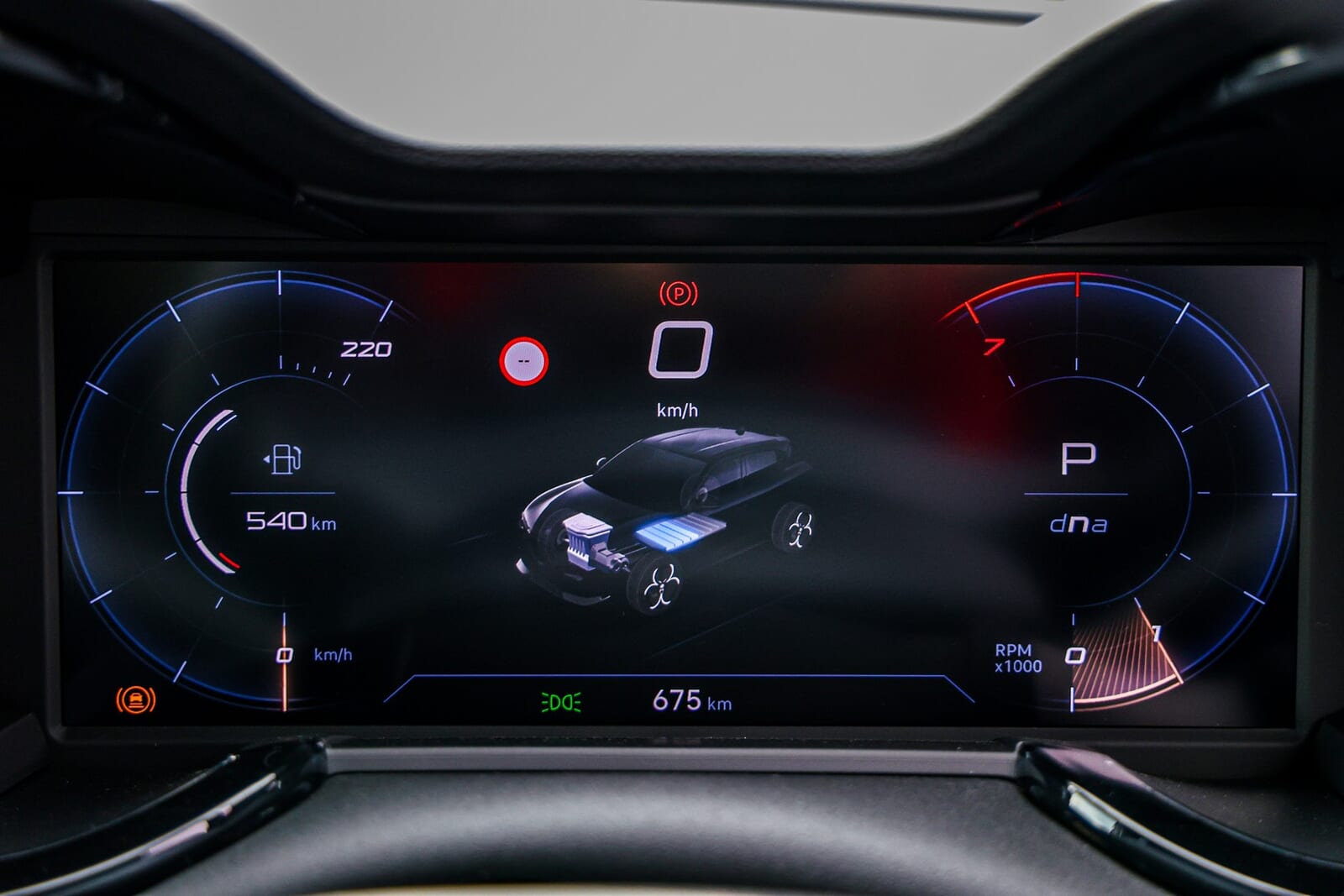 ダッシュボードに置かれたスペックシートを改めて確認してみる。心臓部に収まるのは、直列3気筒DOHCターボチャージャーエンジン。総排気量はわずか1199ccだ。これに、フロントに搭載された16kW(約21PS) / 51Nmを発生する交流同期電動機(モーター)を組み合わせた、48Vのマイルドハイブリッド(MHEV)システムである。最高出力はエンジン単体で100kW(136PS相当)、最大トルクは230Nm。トランスミッションは電子制御式6速デュアルクラッチ(DCT)が担う。