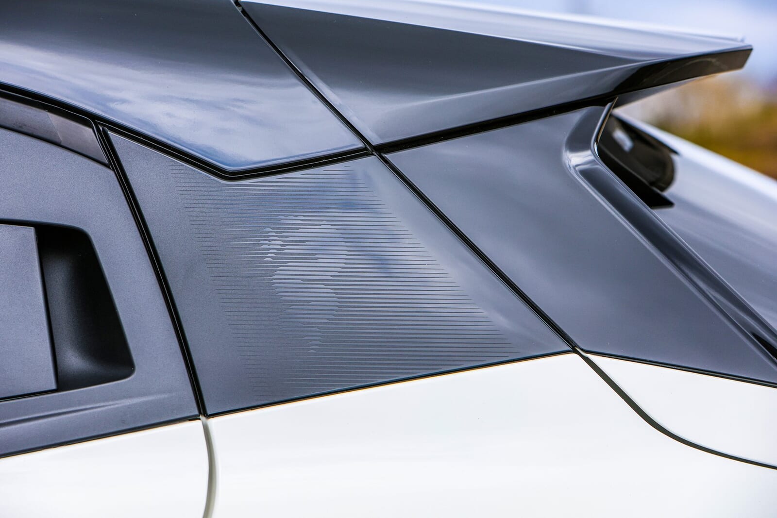 エンジニアリングの観点から見ても、このフラットな面を強調したホイール形状は、高速走行時にホイールハウス内で発生する乱流を効果的に抑制し、車体側面の整流効果を高める役割を果たしている。コンパクトカーでありながら、高速域でのスタビリティや燃費性能(WLTCモード 23.1km/L)に直結する、理にかなった機能美である。