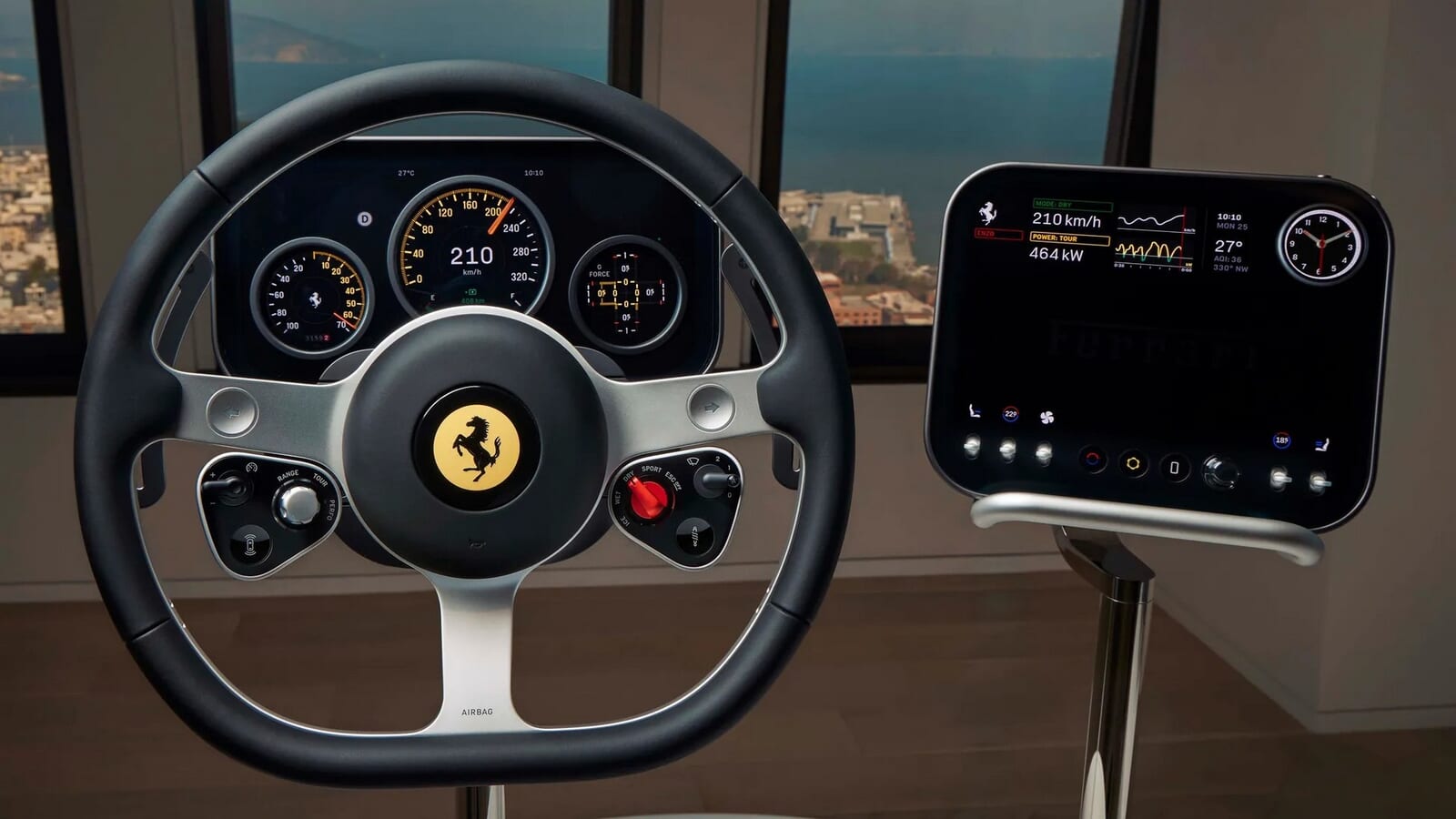 ステアリングホイールは、特別に開発された100%リサイクル・アルミニウム合金製で、CNC(コンピュータ数値制御)加工された19個の独立したパーツで構成されている。1950年代から60年代のクラシックなフェラーリに見られるMomo(モモ ※2)製のステアリングホイールから明確なインスピレーションを得ている。