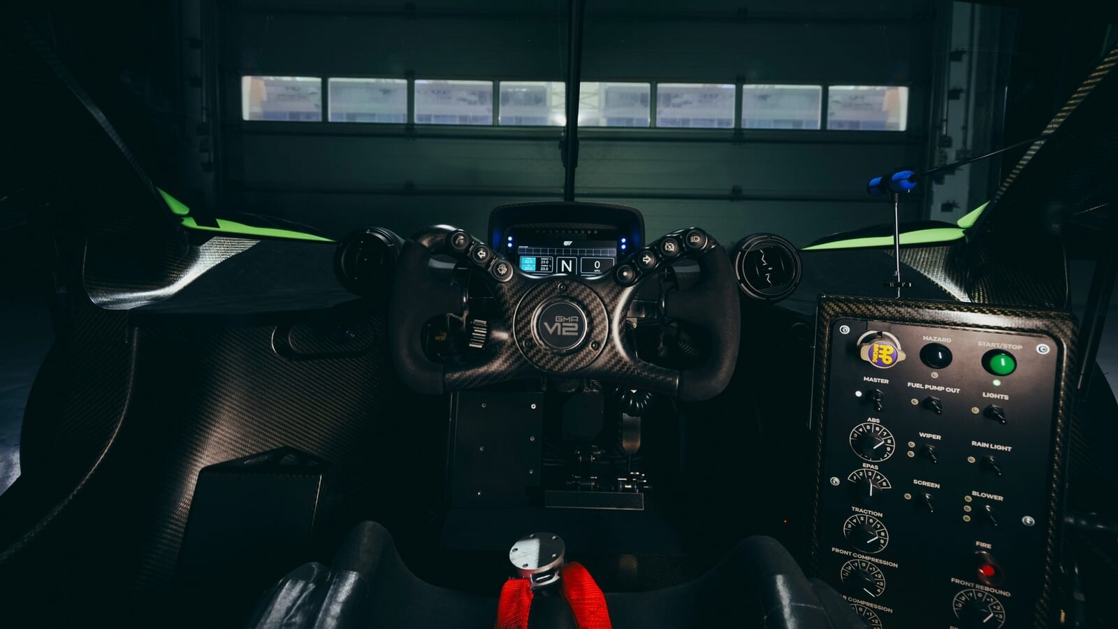 その苦痛に見合う見返りは即座にやってくる。なんて視界だ! カウル(フロントガラスの下部)が非常に低いため、まるでシングルシーター(フォーミュラカー)に乗っているかのように、路面と接しているように感じる。ここでもパッケージ全体の狭さが役立っており、これはT.50Sの体験を定義する、マレーの多くの執着の最初のひとつであり、ただただ即座に、明白に、信じられないほど理にかなっている。カーボンファイバー製のステアリングホイールはバットマンのマークのように見え、感触は最高だ。ピットラジオ、ウインカー、ワイパー、ハイビーム、ピットリミッターなど、いくつか必要なボタンがついているが、上位のフォーミュラカーやレーシングプロトタイプに比べると非常にシンプルで直感的だ。