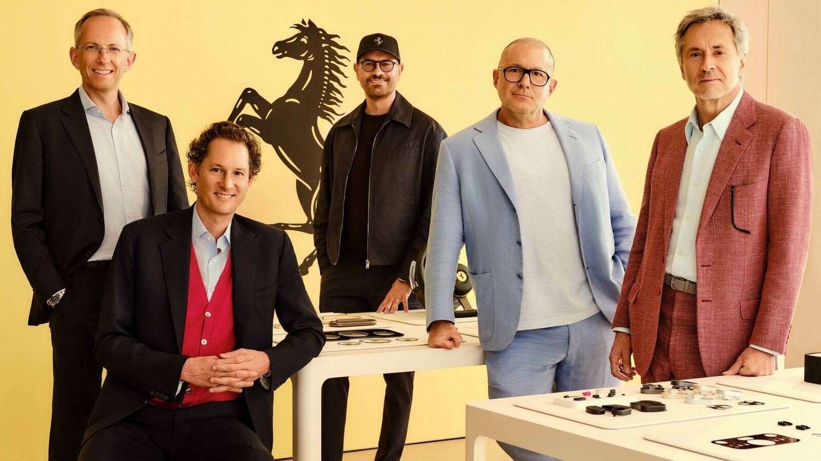 (写真左から:フェラーリCEOのベネデット ビニャ、ジョン エルカン会長、チーフデザインオフィサーのフラビオ マンツォーニ、LoveFrom創設者のサー ジョニー アイブとマーク ニューソン)