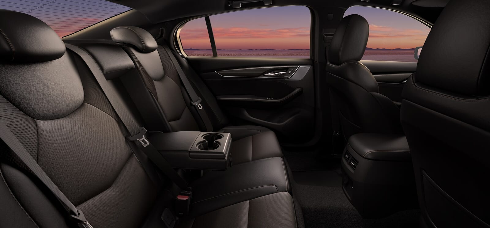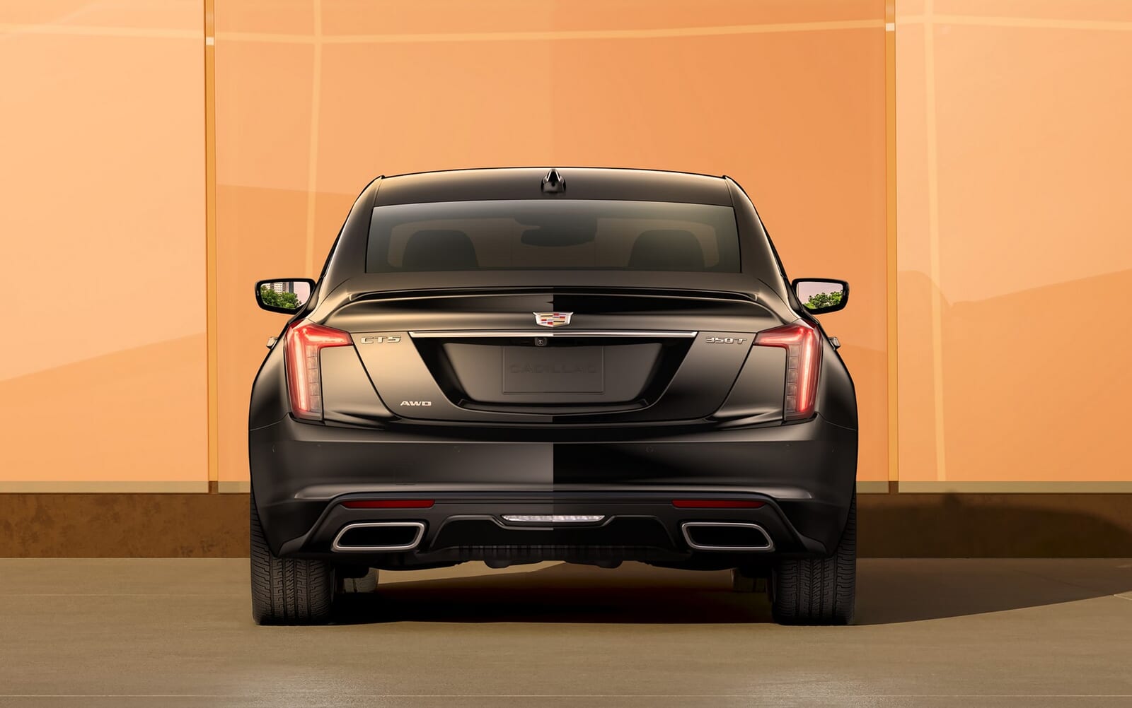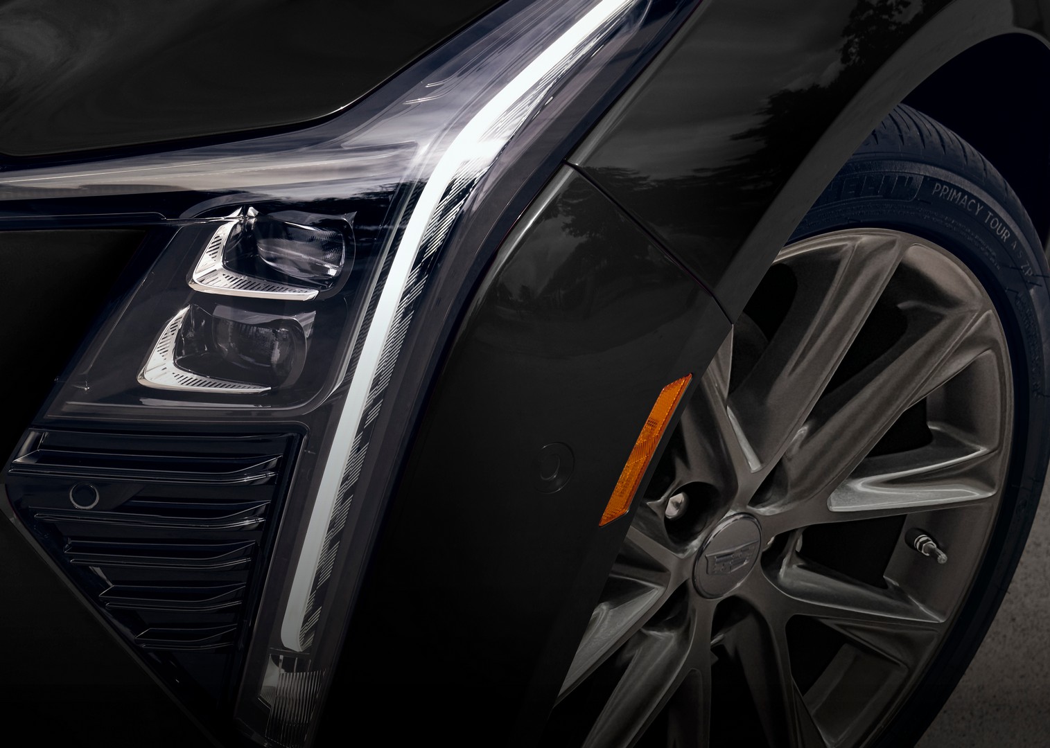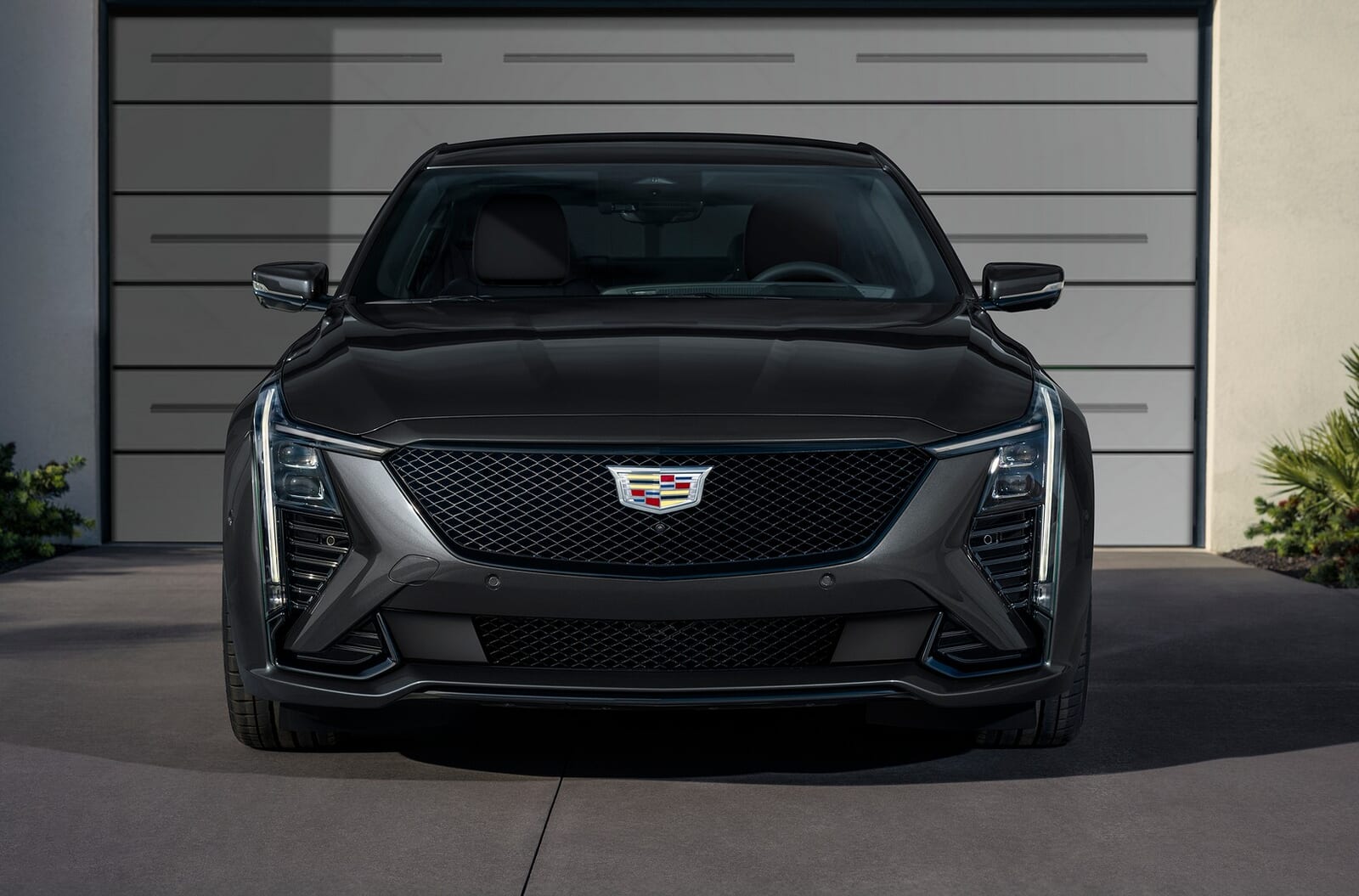 まず目を引くのは、ブランドの新たなデザイン言語によって刷新されたエクステリアだ。元来、キャデラックは「アート&サイエンス」というデザイン哲学のもと、エッジの効いた直線的なスタイリングで他社との明確な差別化を図ってきた。新型CT5では、そのアグレッシブなスタンスがさらに研ぎ澄まされている。フロントマスクはより低くワイドに構え、パフォーマンスブラックメッシュグリルが精悍さを猛烈にアピールする。そしてキャデラックの絶対的なアイデンティティである「バーティカルシグネチャーライト(垂直方向のLEDライト)」も再設計され、夜の高速道路のルームミラー越しでもひと目でそれとわかる強烈な存在感を放っている。全長4,935mm、全幅1,895mm、全高1,445mmという堂々たる体躯と、2,935mmのロングホイールベースがもたらす流麗なシルエットは、徹底したエアロダイナミクスの最適化と相まって、静止していてもその高い運動能力を雄弁に物語る。
