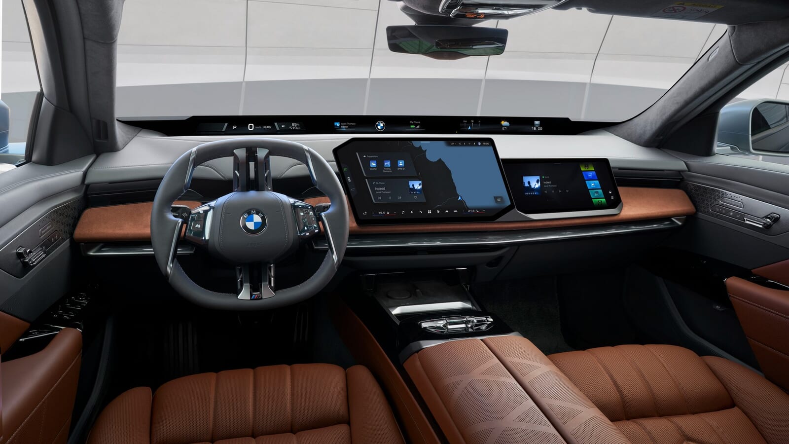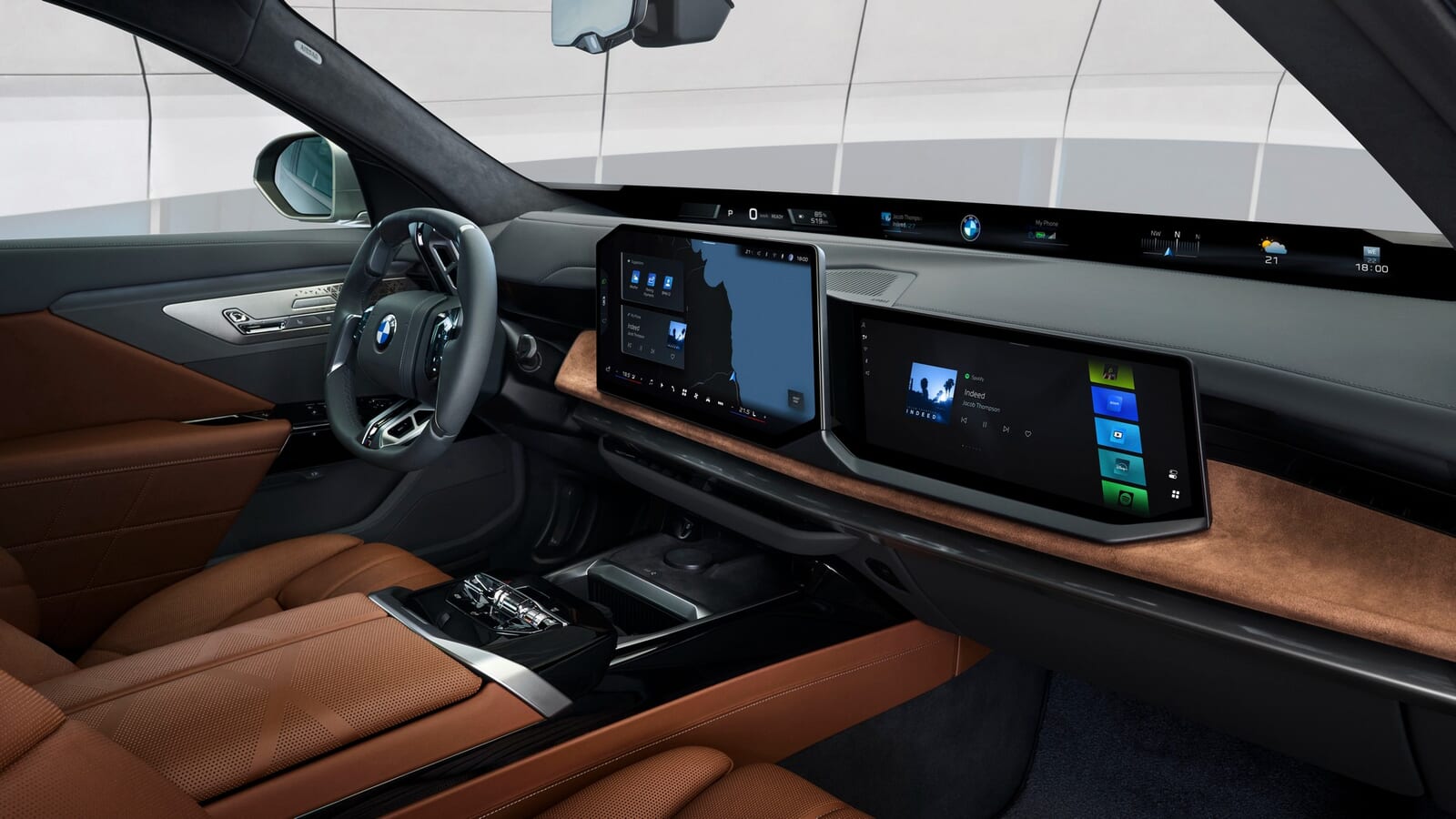 フロントではダッシュボードが刷新され、フローティング式〔※ダッシュボードから浮いているように見えるデザイン〕の計器パネルに加え、BMW車初となる14.6インチの助手席専用スクリーンが標準装備された。当然ながらパノラミック iDrive〔※BMWの大型湾曲ディスプレイを中核とするインフォテインメントシステム〕とBMWのOS X〔※BMWの最新車載OS〕も搭載される。
