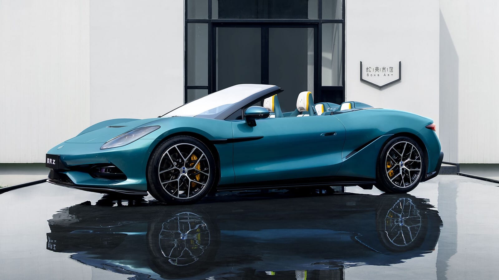 北京モーターショーでの現地市場向け発表から届いたばかりの姿がこれだ。写真と詳細は夏にさらに公開されるが、今の時点で判明しているのは出力が約1,014PS〔※1,000bhp。おそらくZ9 GT〔※デンツァ ブランドのフラッグシップ電動サルーン〕から流用した952PSの3モーター構成〕で、0-100km/h〔※0-62mph〕2秒以下を主張しており、今回のリトラクタブル ルーフはファブリック ソフトトップ〔※布製の電動開閉式幌〕だということだ。