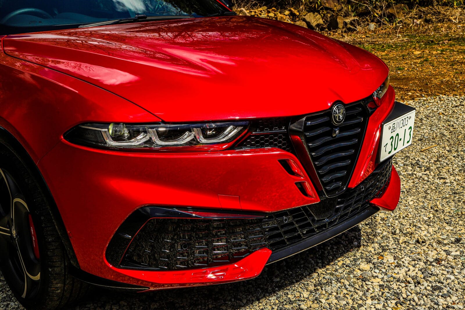 佇むアルファ ロメオに求められるのは、ひとめで「アルファ ロメオ」とわかる出で立ちと官能的な美しさであろう。現在、ボディシルエットだけでなくヘッドライトやテールライトといったディテールまでもが似通ったクルマが巷には溢れている。個性の演出やブランディングに力を注いでいるメーカーの思惑とは裏腹に、グローバル化した自動車産業におけるカーデザインのコモディティ化は、ある意味において当然の帰結とも言えるだろう。こうした現象は大衆車だけでなく、ハイパーカーやスーパーカーという少数生産のクルマでも見受けられるのだが、トナーレはクルマに詳しい人であればひと目でアルファ ロメオであることが認識でき、クルマに疎い人でも他車とは異なるまるで意志をもつ生命体のような印象をトナーレから受けるだろう。週末、郊外の大規模ショッピングモールのパーキングに駐車しても、まわりのクルマと同化してしまわない個性をもったデザインであることは間違いない。まずは見た目のアンチ・コモディティは成功しているようだ。