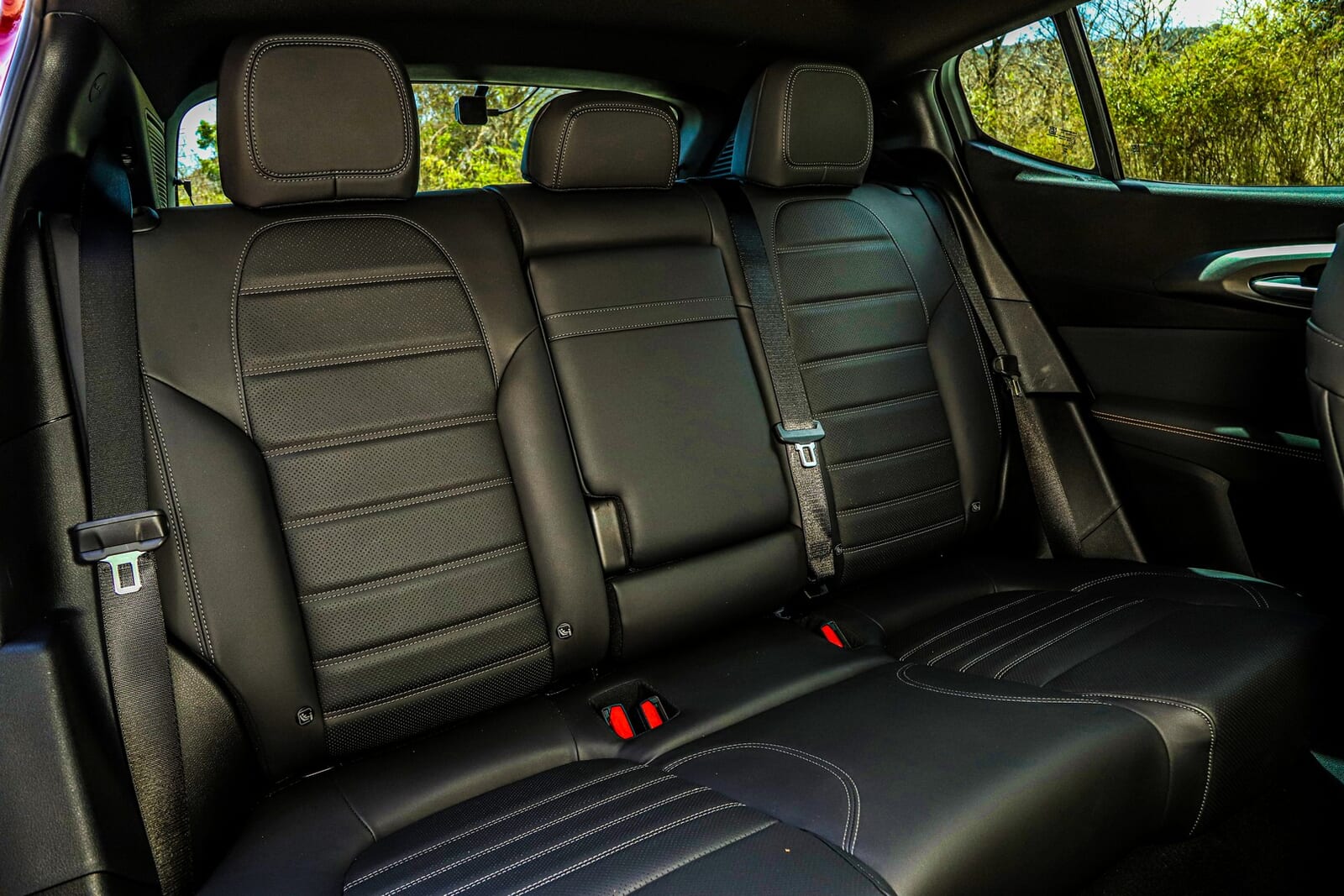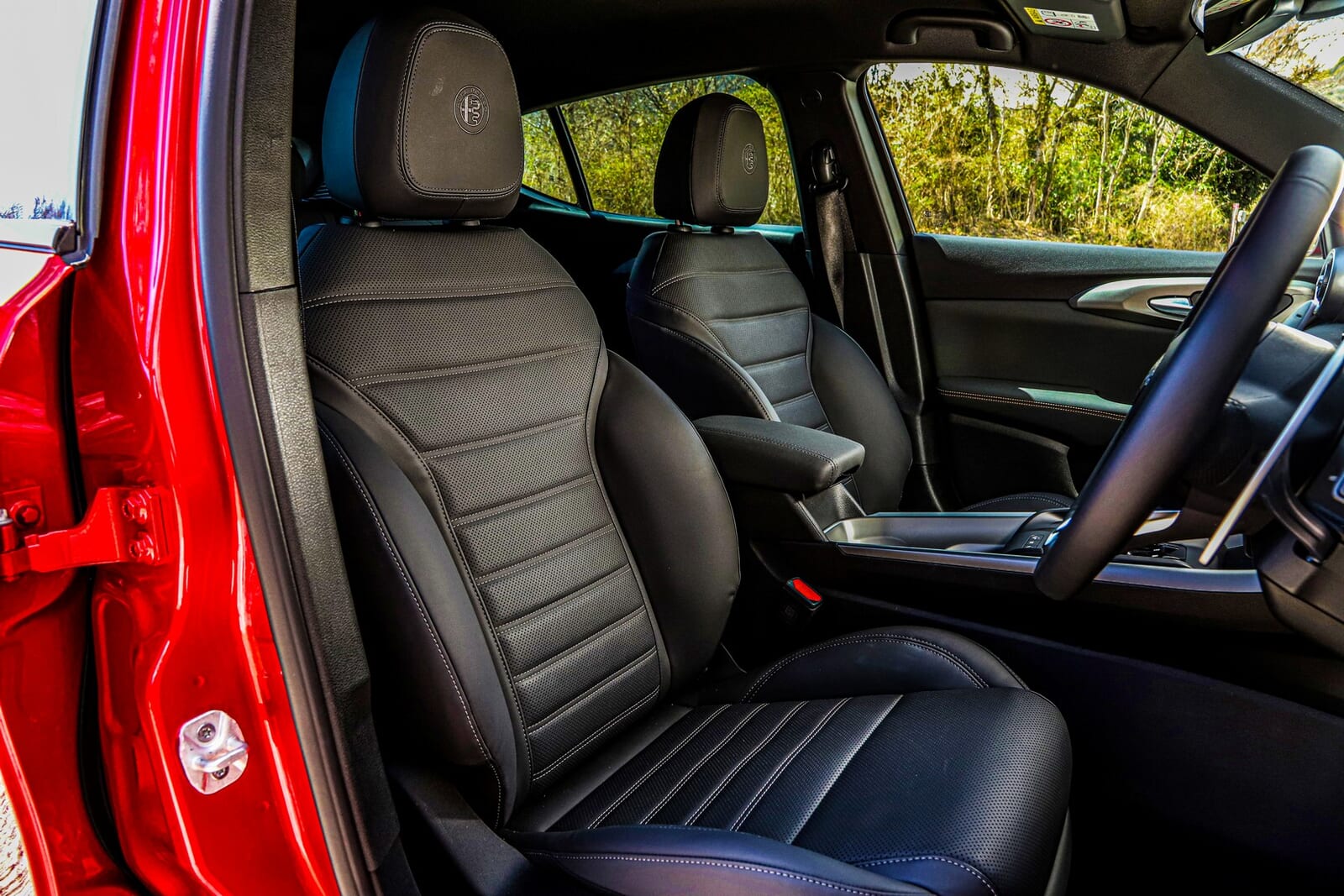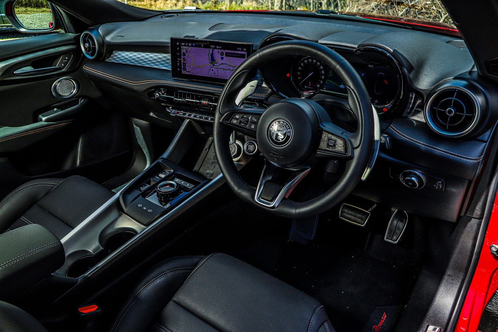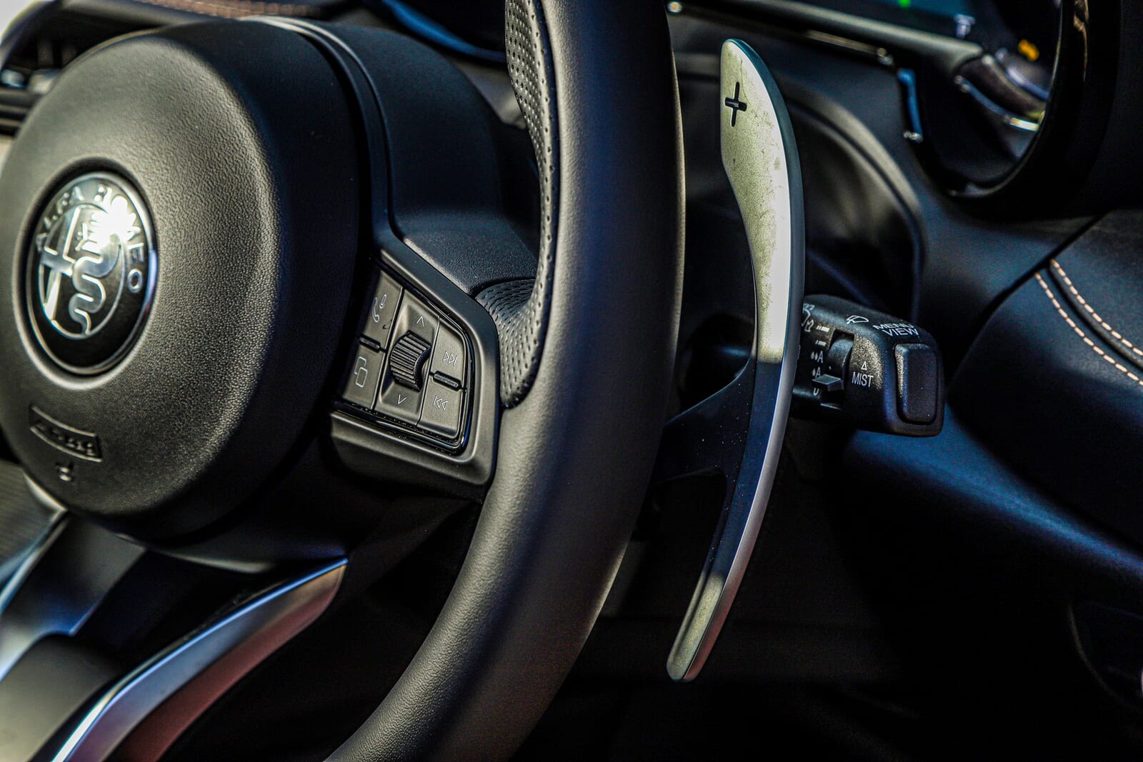 アルファ ロメオらしいピンッと張った硬めのシートに着座すると、スピードメーターとタコメーターを液晶でアナログ表示したメーターパネルと、ダッシュボードの左右両脇にある円形のエアコン吹き出し口などから、アルファ ロメオらしさが伝わってくる。センターコンソールにはシフトレバーではなくロータリーセレクターが収まっているが、アルファDNAドライブモードシステムの切り替えスイッチと同じく円形になっているのは、むしろデザイン的には統一感がとれて好ましい。個人的にジャガーやランドローバーのロータリーシフトに馴染みがあることもあって、操作にも違和感はまったくない。