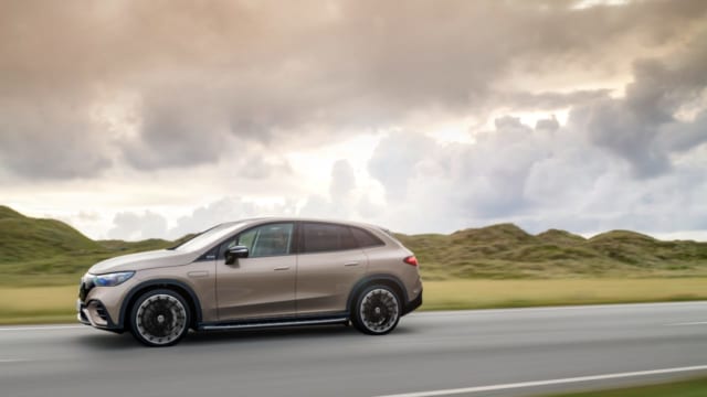 Profile driving shot of Mercedes Benz EQE SUV